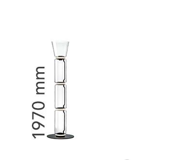 Standing lamps consisting of interconnecting glass modules reaching a height of 2,17 metres (85.43"). Cylindrical and semi-spherical transparent blown glass structure, die cast aluminium base and rings, hydroformed steel internal lateral arms and injection moulded optical opal silicone outer ring diffusers. The power supply cable is 2 metres (78.74") long, with a pedal operated panel used as a dimmer to adjust the light intensity by 10% to 100% in either direction. Wall mounted power supply unit with interchangeable plugs.