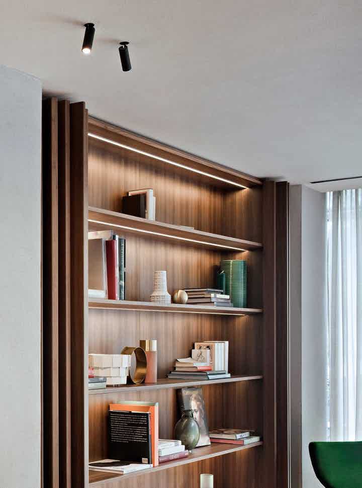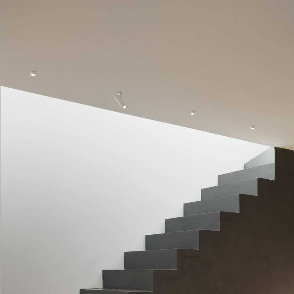 Interior lighting spotlight with LED light source. Available in three versions: Mono Point version, consisting of a removable cylindrical housing which, in its upper position, acts as a downlight, and in its lower position, becomes a directional spotlight, Double Point version, consisting of a recessed box which houses two spotlights and a Suspension version.