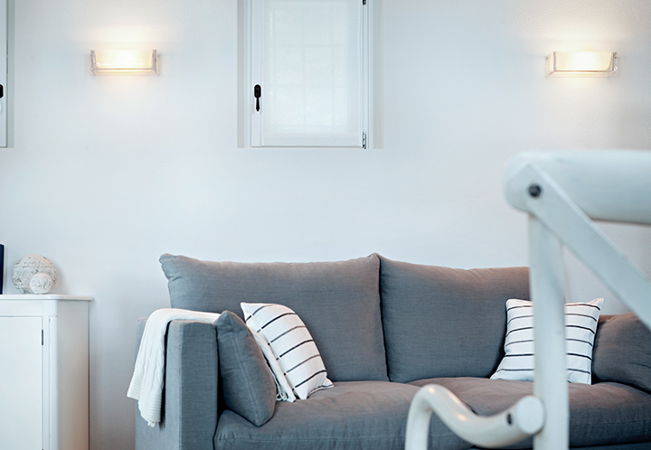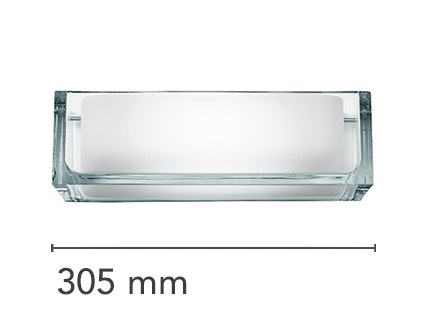 Wall lamp providing direct/indirect and partially diffused light. Lamp body in transparent glass. Internal diffuser in opal glass. The wall mount is a white powder coated, aluminum alloy die-casting including both the wall fitting system and the electrical equipment.
