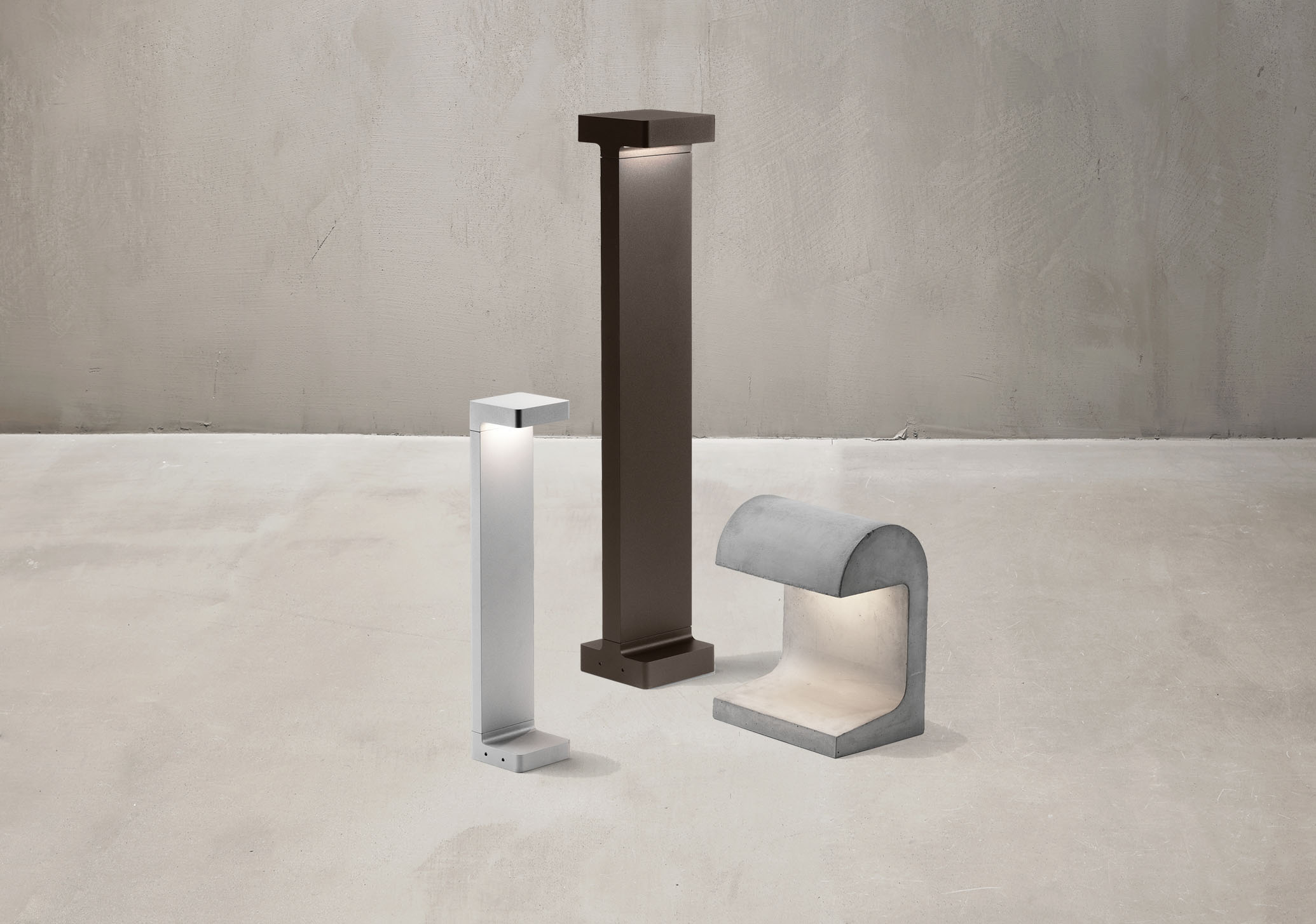 Whenever an architect is requested to be involved in landscaping, the answer is pertinent: he creates architecture. Both worlds are indissolubly connected, where one ends, the other begins. And in some cases they just merge. Casting is a series of miniature lighting icons which fuse landscape and outdoor design. The design of the T and C shapes, casts a clear frame in every background. Its shape clearly reveals the intent of the desired light direction. An expression and attitude of modernist periods “when form follows function”. The half-rounded model, Casting Concrete, refers to a more brutalist architecture. The lamp Le Corbusier developed for the city of Chandigarh was for me love at first sight, it perfectly embodies brutalist architecture “avant la lettre”. I wanted to pay tribute to this archetype by giving it a contemporary interpretation… and with a touch of Flos. An archetype geometry and a solid base, enhanced by a concrete material that reflects its mass.