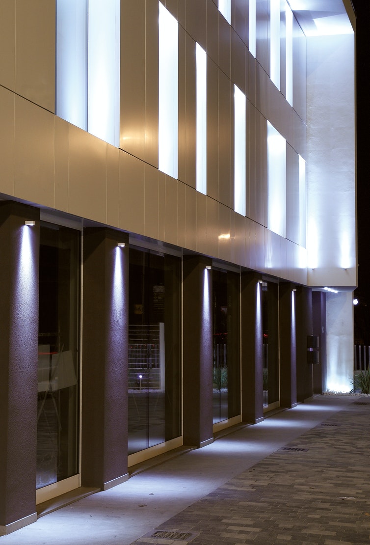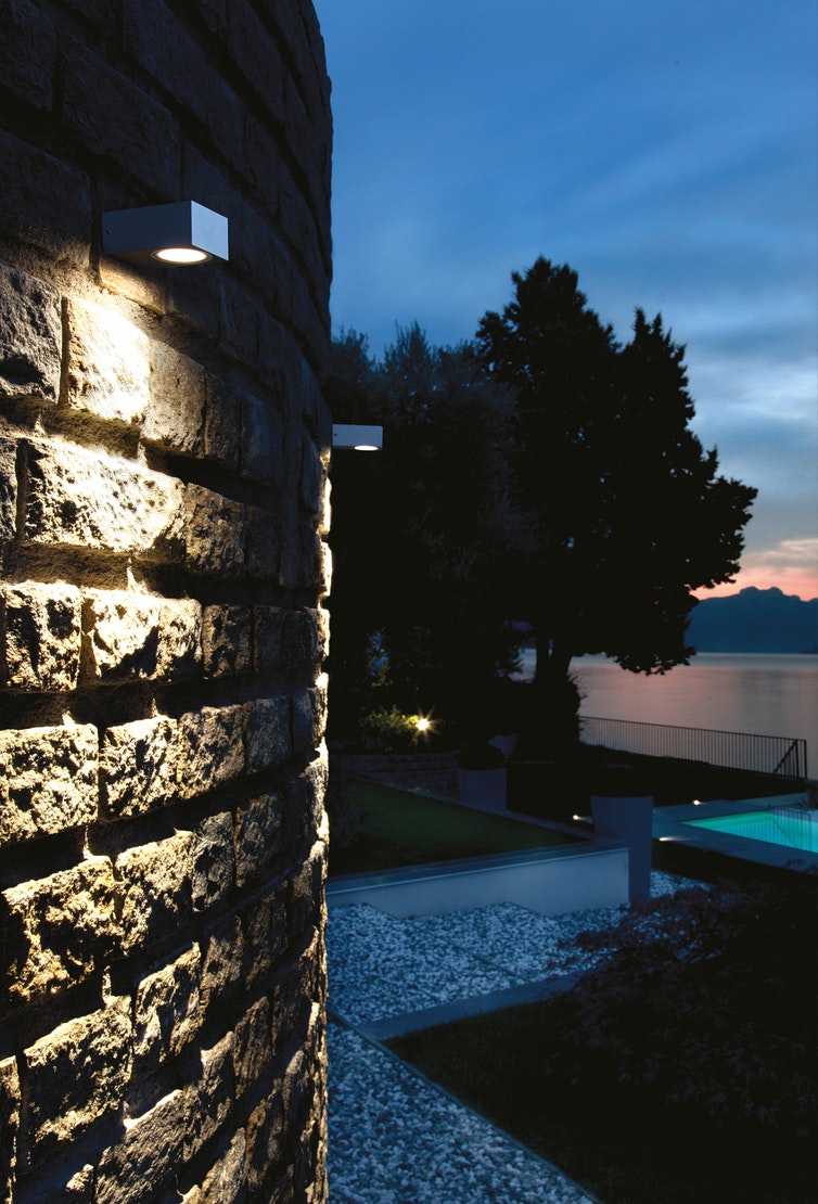 Rectangular luminaire for wall installation, available for mono-directional emission.Extra clear glass diffuser with silkscreen border.