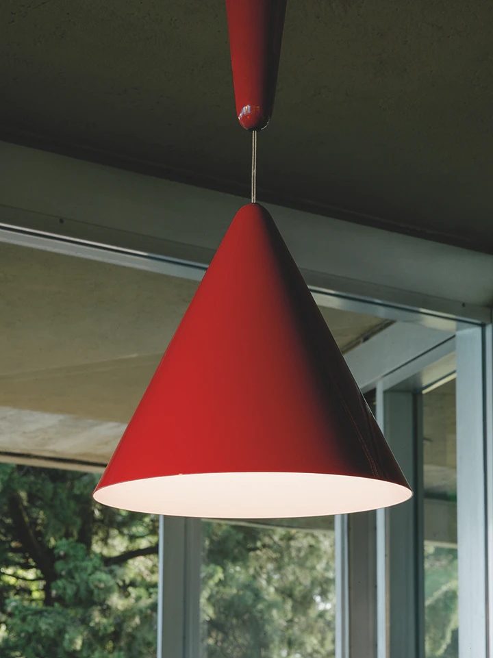 Designed by A. Castiglioni, Diabolo is a pendant light with direct lighting composed of a ceiling rose and diffuser. Body in aluminum.