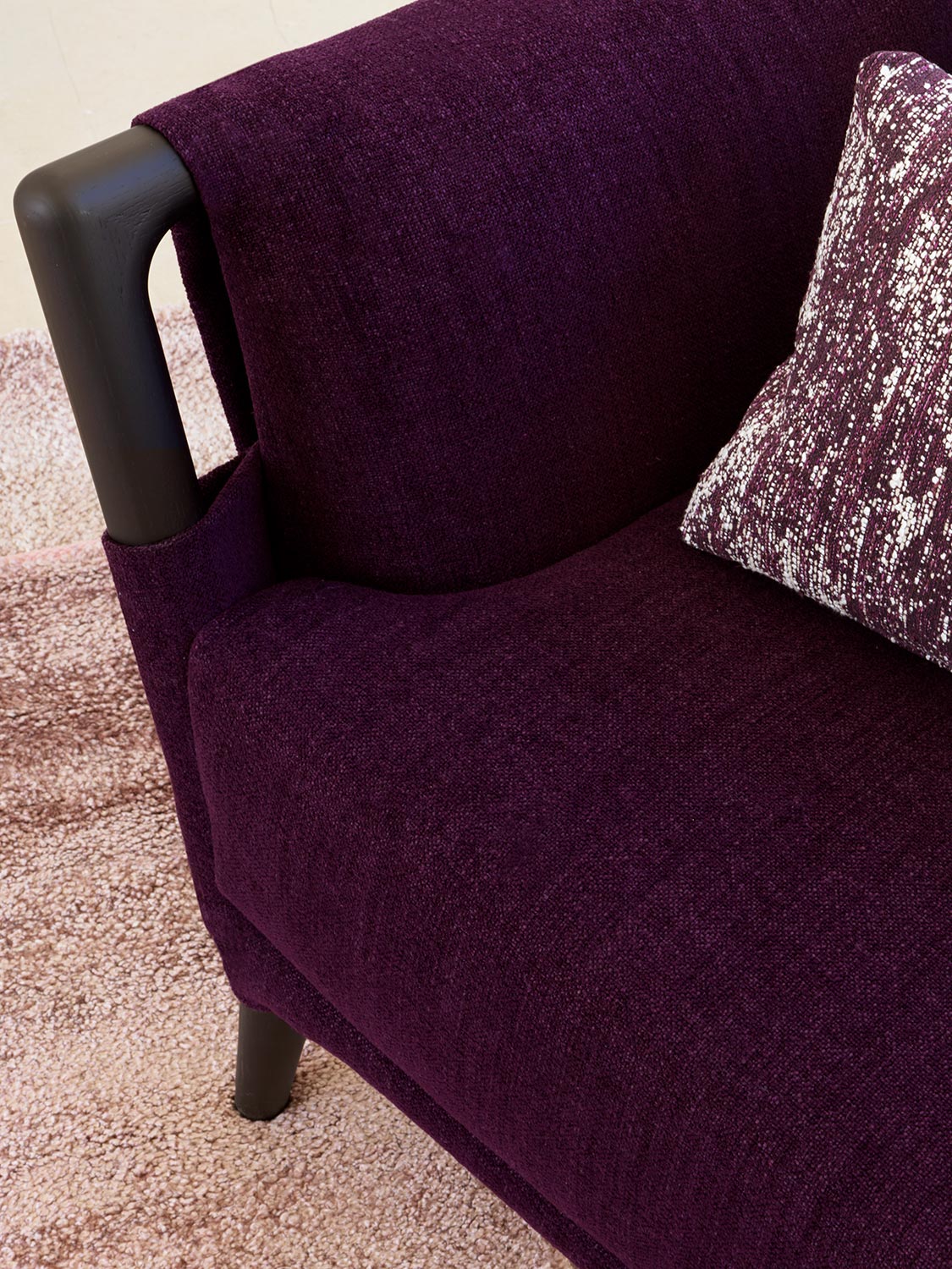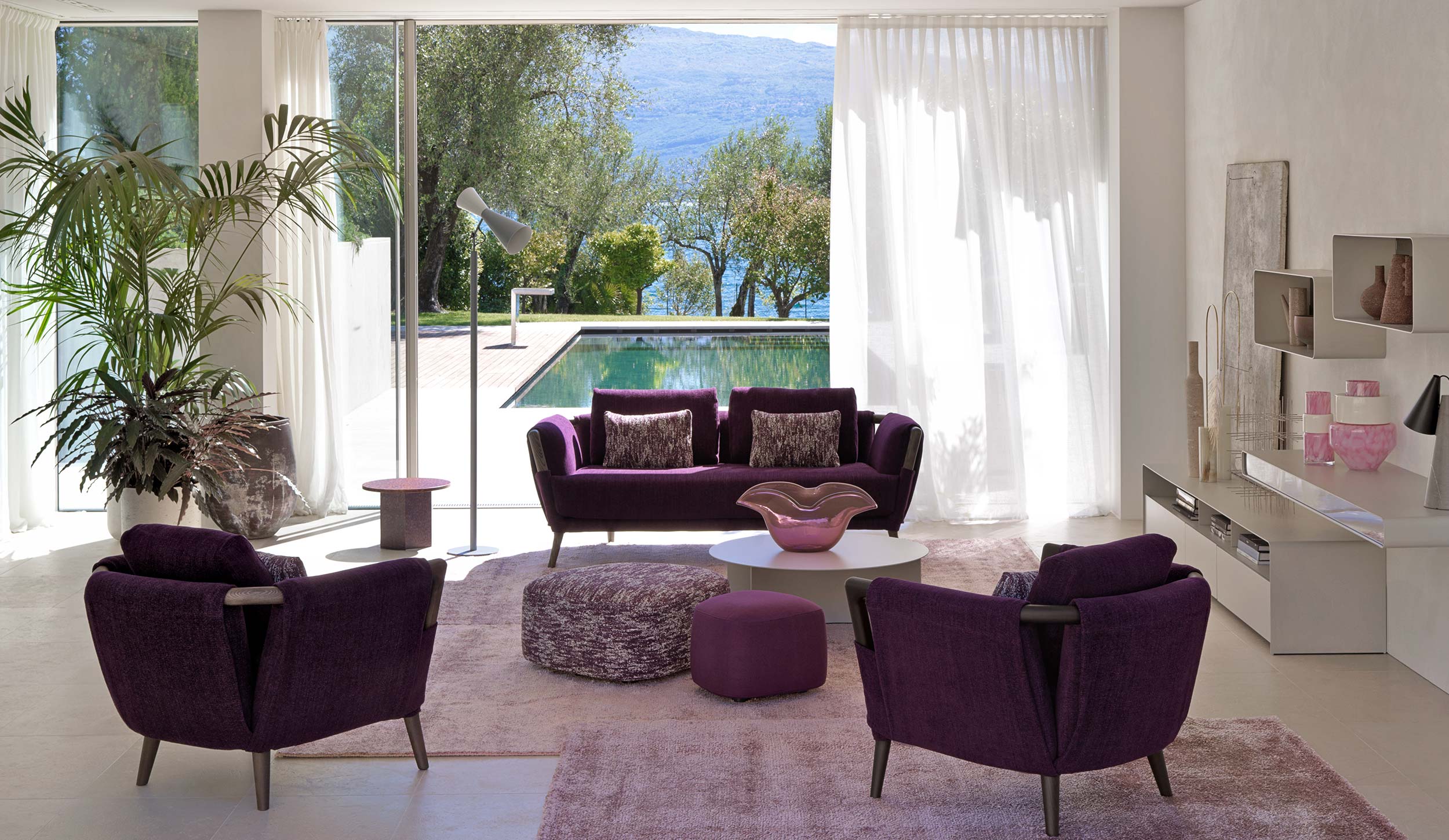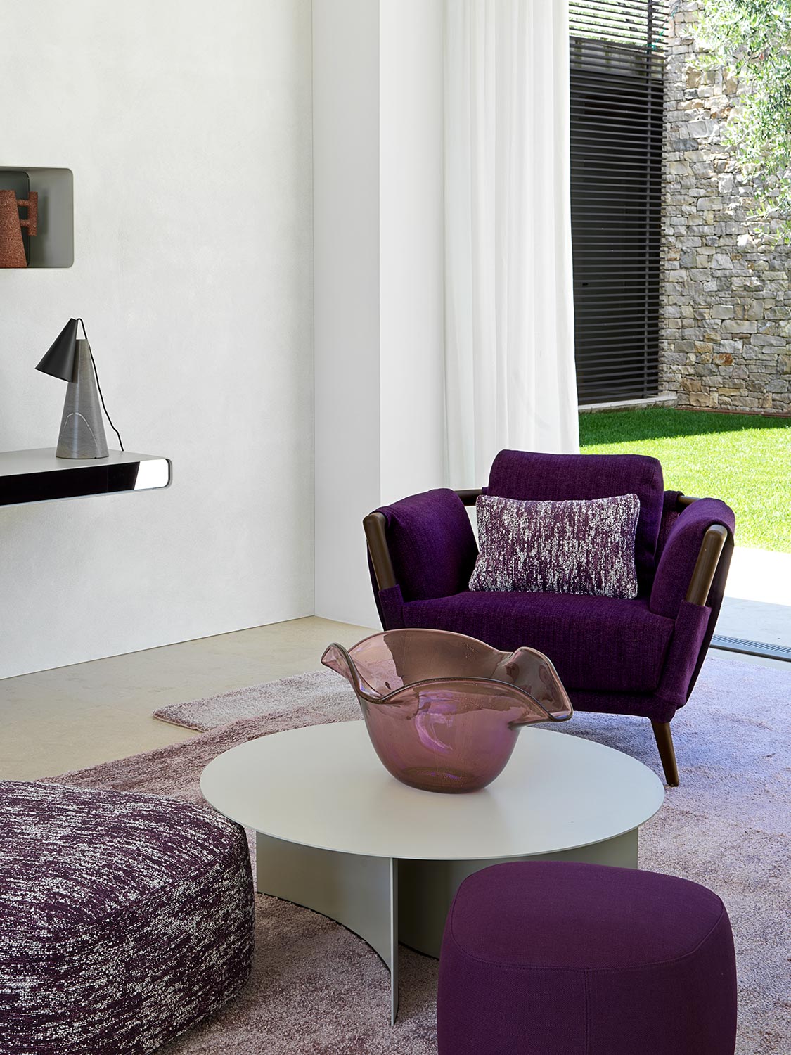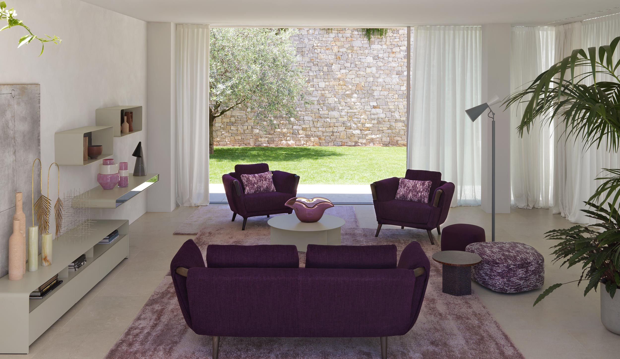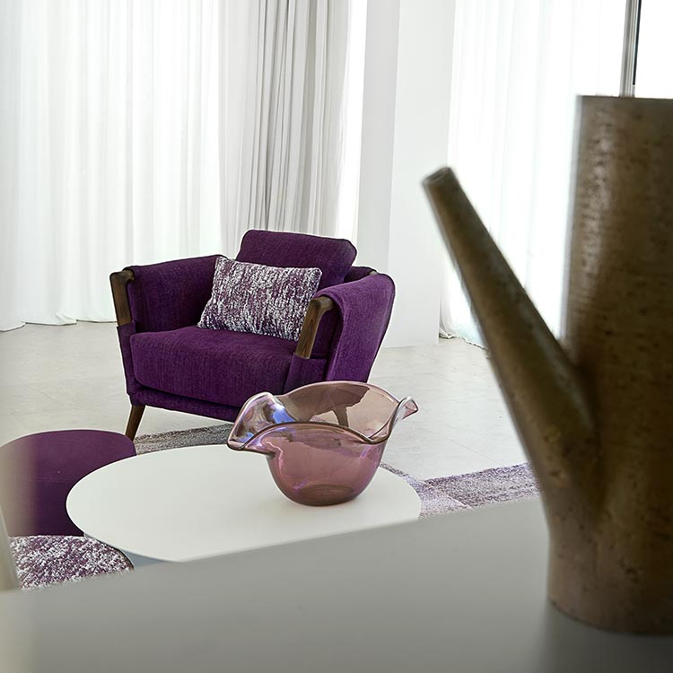The amethyst purple of the Gaudí sofas and armchairs, alone, manages to define the design and outline the spaces.