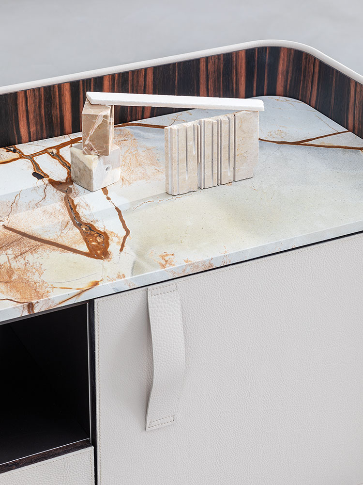 Gentleman餐具柜由兩扇門、抽屜和開放式隔層組成,內部為烏木,外部為新款羅馬帝國大理石。這款大理石精選自巴西,表面有不規則的紋理,暖色系焦糖色。它是以工匠技藝精心打造的珍貴材料,傾注了我們的熱情、精細和對細節的極致追求。這也就是為什么Gentleman系列的每件作品都可被譽為“獨件”。