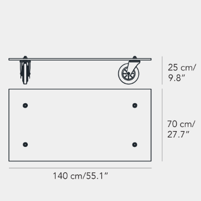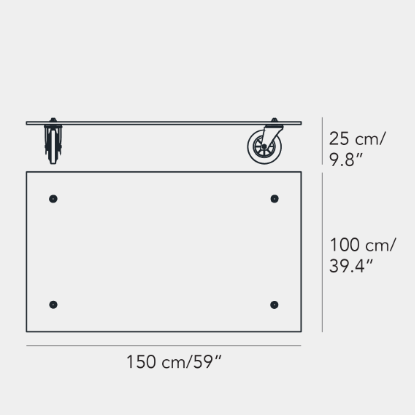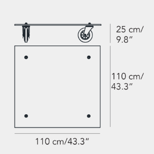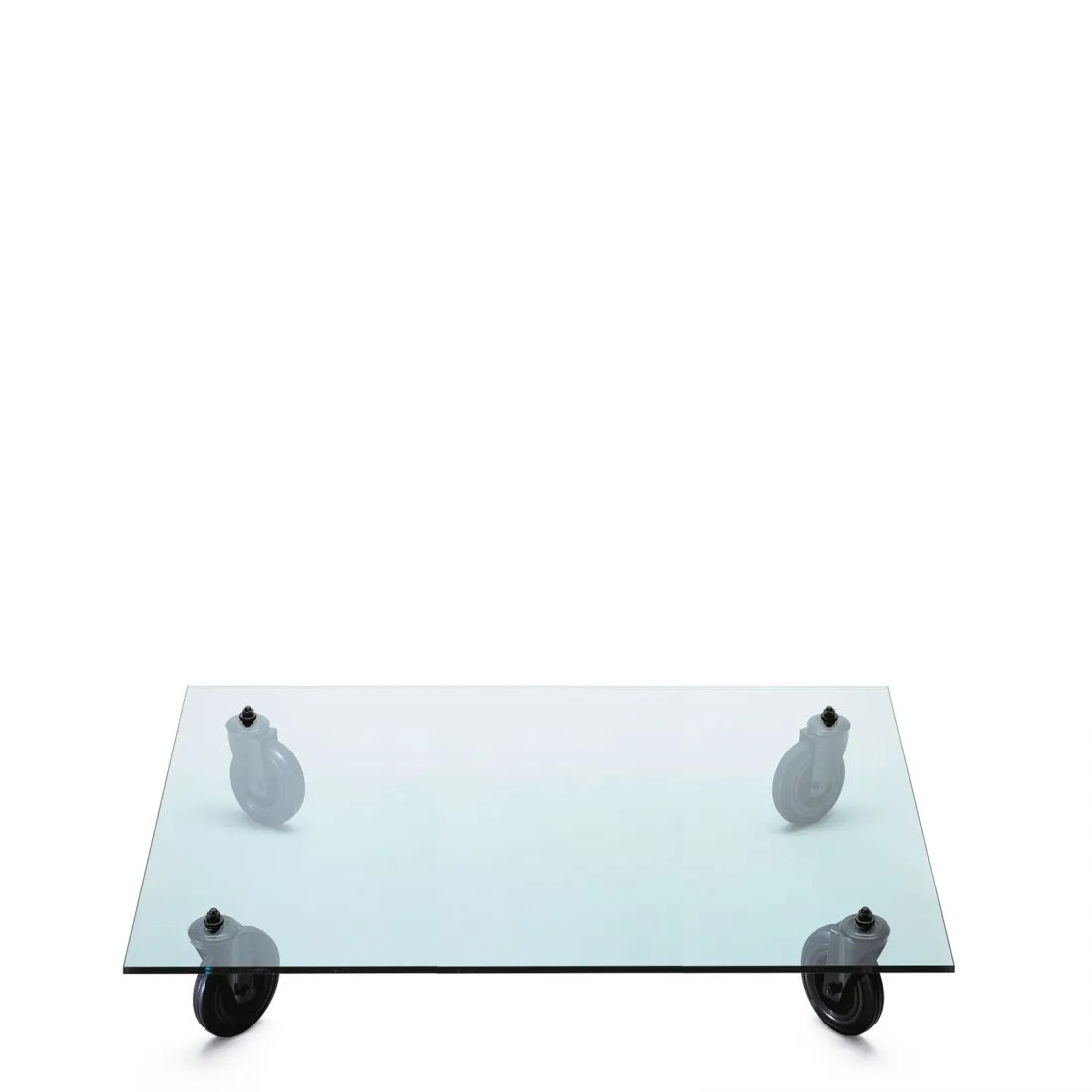 Un carrello industriale utilizzato nella sede di FontanaArte per il trasporto di vetri: è questo l’oggetto che ha ispirato Gae Aulenti nella progettazione di Tavolo con Ruote, esempio di una progettualità intuitiva nata dall’associazione con strumenti di uso quotidiano e tradotta in prototipo senza passare per il disegno. Nel progetto di Tavolo con Ruote il piano di legno del carrello industriale viene sostituito con una spessa lastra in vetro molato -simbolo della storia produttiva dell’azienda – a cui vengono fissate le rotelle industriali a movimento libero. E’ così che la sostituzione di un semplice elemento trasforma la natura dell’oggetto e la sua destinazione d’uso.