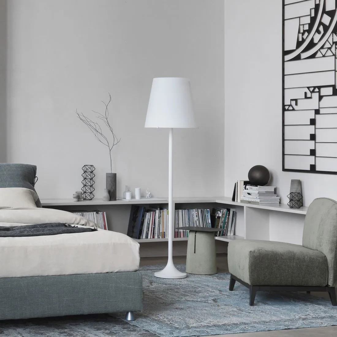 La più classica delle lampade da terra, provvista di una base che diventa, senza soluzione di continuità, uno stelo. Una lampada che arreda gli ambienti con stile e li illumina con accuratezza ed eleganza.