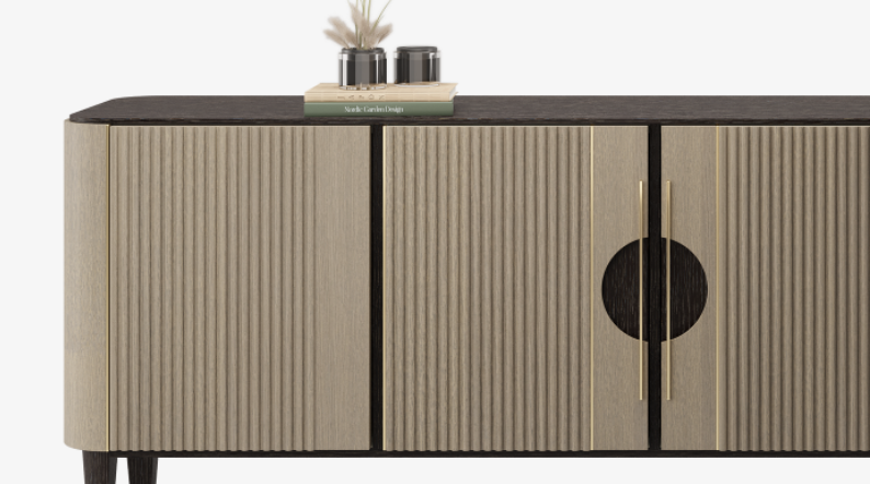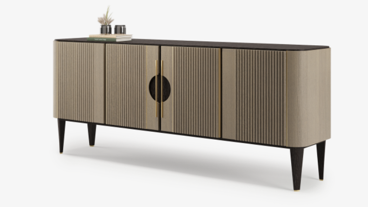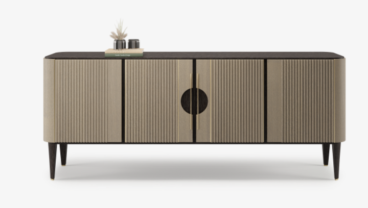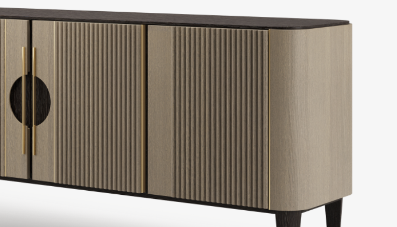Employing a clean-cut profile, the suave TAIPEI sideboard adds texture and dimension to its form with fluted door fronts and contrasting shades of solid wood and veneer. Slimline brushed-brass accents provide the final touch.