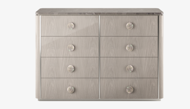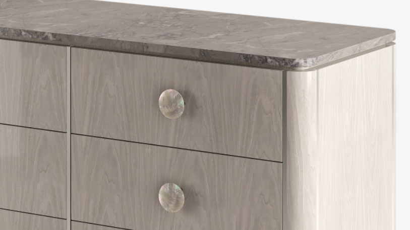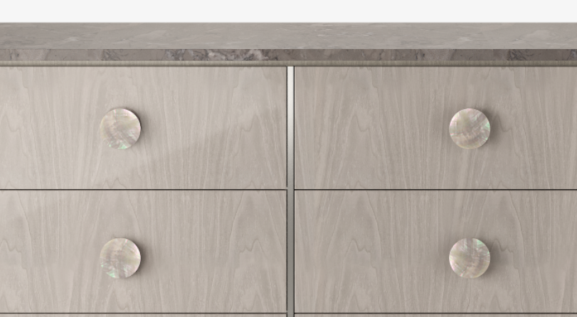 "Grey tones bring harmony to a variety of patinas that make up the archetypal BERNA Chest of Drawers. Blending veined wood veneer with a variegated stone surface and black mother-of-pearl handles, its silhouette is underscored with accents of polished stainless steel. "