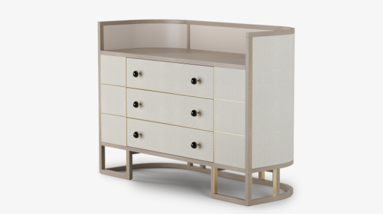 Making organisation glamorous, the PARMA chest of drawers feature an elegantly curved shape. Richly textured leather inlays give it chic appeal. It pairs perfectly with other pieces from the PARMA collection.