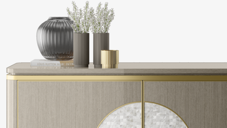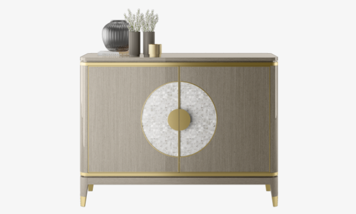 The striking SEVILLE cupboard uses elegant materials to elevate a pared-back silhouette. Crafted from glossy wood veneer, details of brushed brass and a circular inlay of white mother of pearl catch the light and the eye.