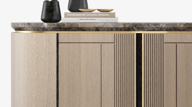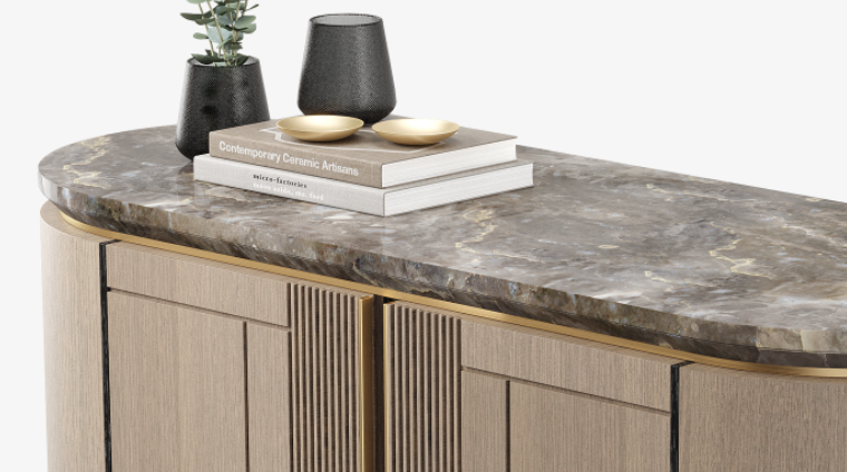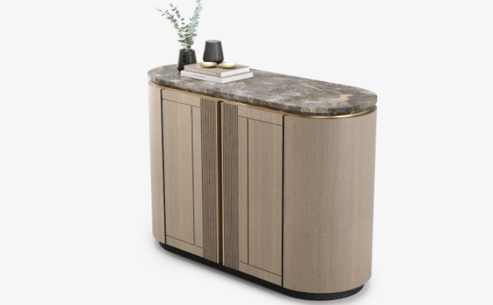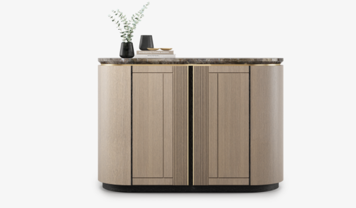 A marriage of function and form, the two-door TUSCANY cupboard grabs the attention with its Art Deco-style detailing across the front. A blend of veneer, solid wood and brushed brass, the design's smooth curves will add a sense of flow to your space.