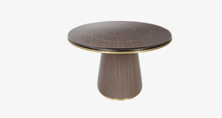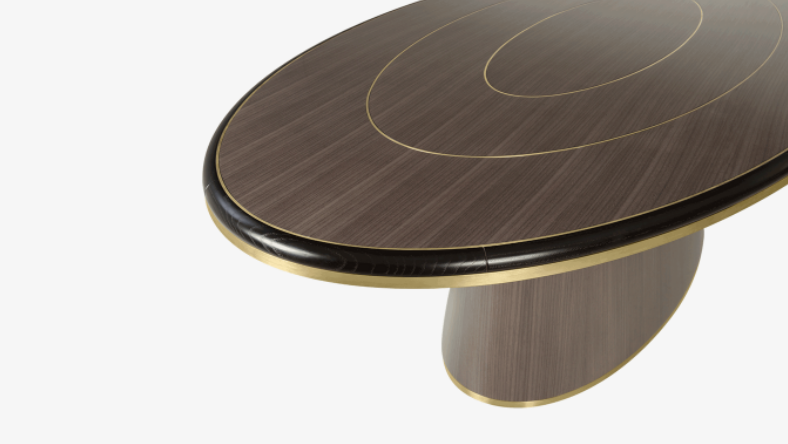 A symphony of oval shapes, the BREMEN dining table features a substantial pedestal base and an elongated top that reaches 280 centimetres in length. Fashioned out of wood veneer, embellishments include a series of brushed-brass ovals that echo outwards across the surface.