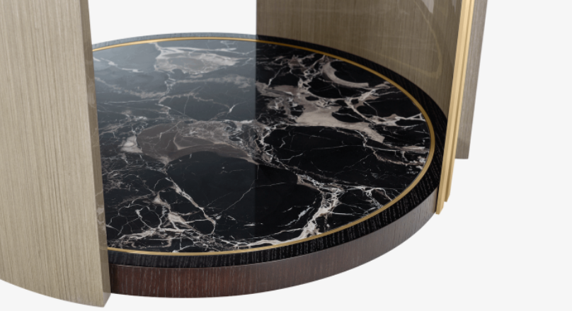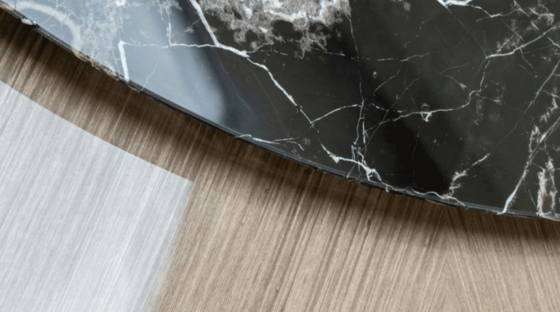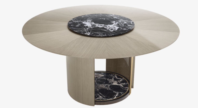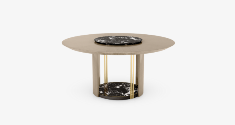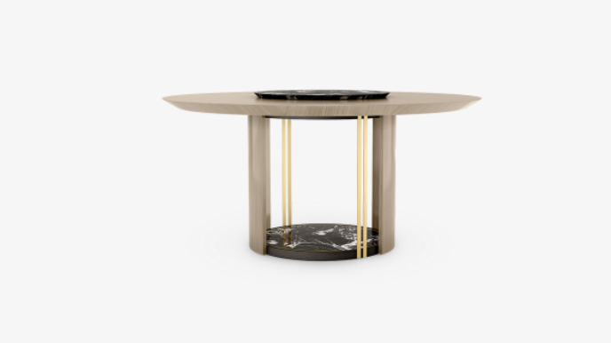 Crafted from wood veneer, the graceful SENDAI dining table features a stone centrepiece that is actually a rotating tray, introduced to make the serving and sharing of food effortless. This stone circle is then repeated at the base, which is further enlivened with details of brushed brass.