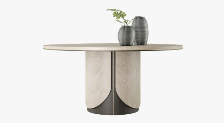 The stylish TREVISO design adds a contemporary twist to the form of a classic circular dining table with pedestal base, playing with dark and pale wood veneer to create an optical illusion that hints at an alternative silhouette.