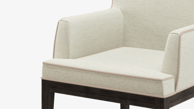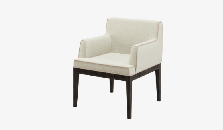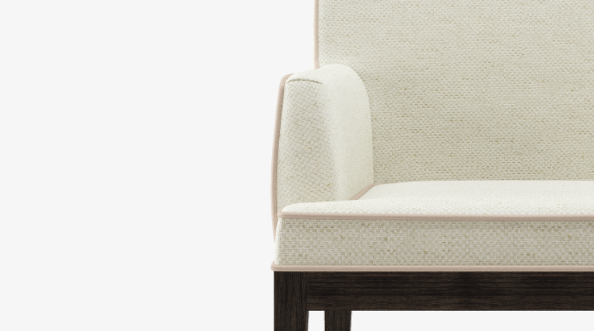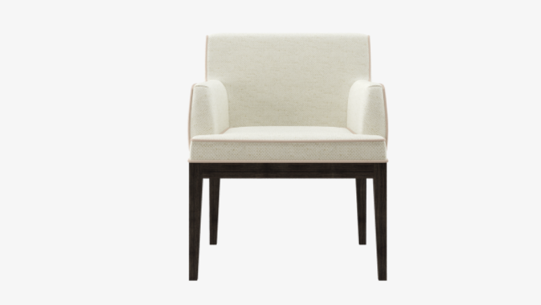 An immaculate armchair, the ABU DHABI design features a square seat and neatly rounded arms and backrest. Tailored upholstery is edged with piping details, a soft touch that contrasts beautifully with the solid wooden legs.