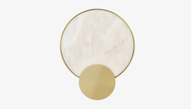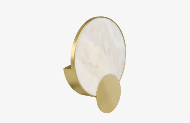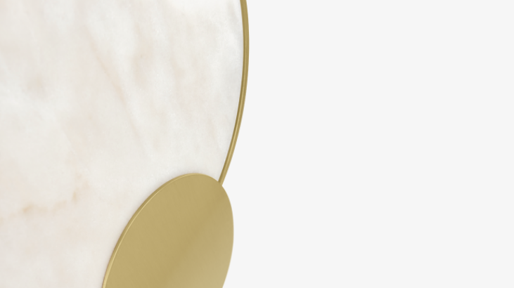 Warm veined stone and brushed brass combine in our PETRA Wall Lamp, where overlapping discs create a subtle geometric design that casts an atmospheric glow.