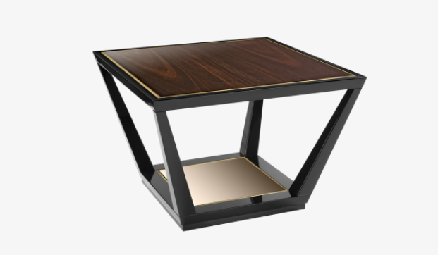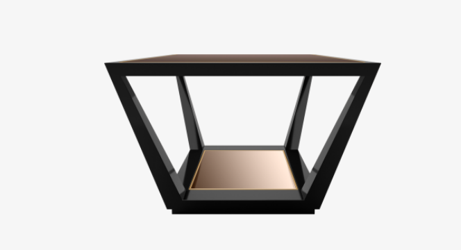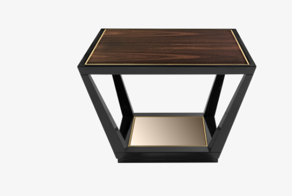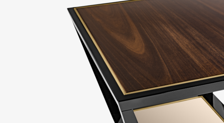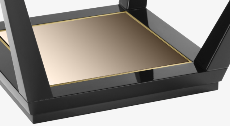 The HAMBURG Coffee Table dexterously employs reflective materials and dimensions to play with perspectives. An amalgam of shiny lacquer, glossy wood veneer and brushed brass, its square top rests on legs that widen towards the base where a mirrored inlay adds to the optical illusion.
