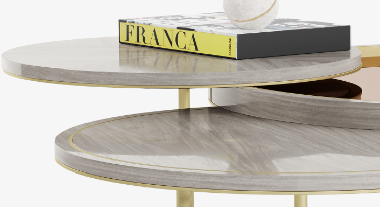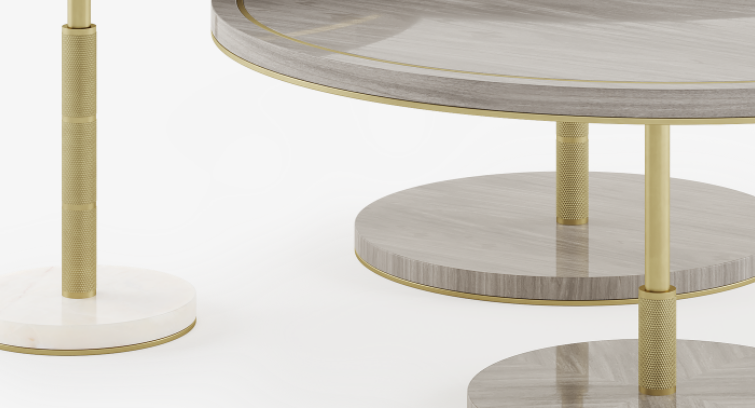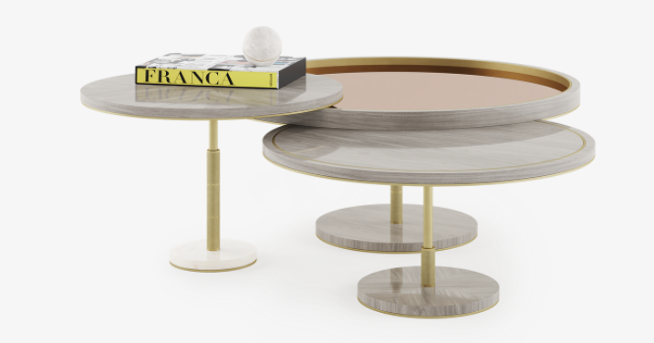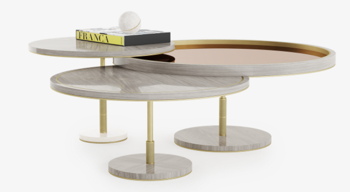 The distinctive SEATTLE Coffee Table incorporates three different volumes that casually overlap, providing a multitiered surface space. Crafted from a palette of glossy wood veneer, stone, brushed brass and bronze mirror, this piece is a simple way to introduce mixed materials to a living space.