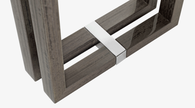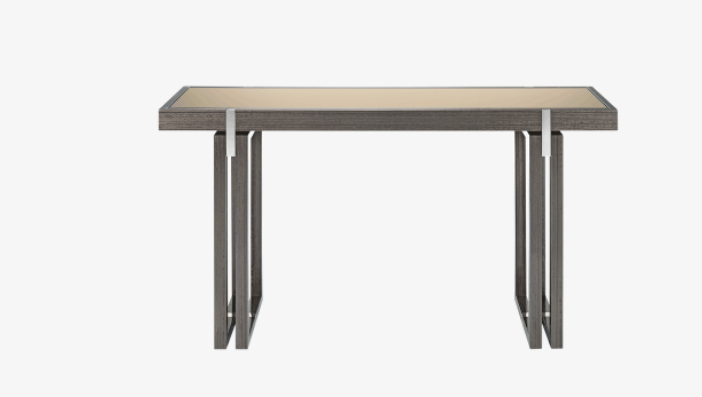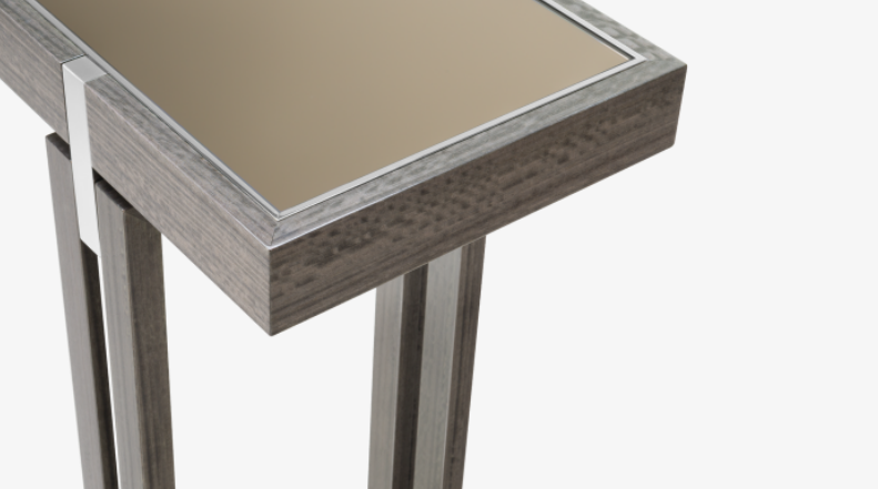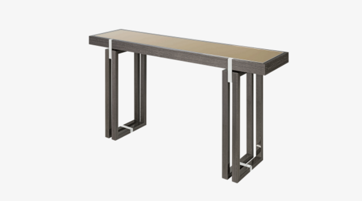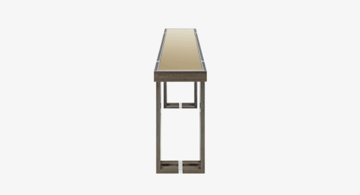 A celebration of the geometrics of rectangles, the sleek SEOUL Console features two-fold legs crafted from wood veneer, joints of stainless steel and a surface inlaid with bronze mirror, the latter captivating the attention by reflecting any objects displayed on top.