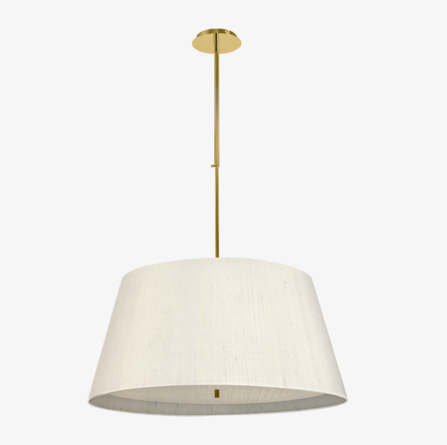 One of our most traditional-looking ceiling lamps, the DARWIN is proof that pure and simple equals chic. A modest brushed-metal frame suspends a large, flared, double-silk shade, complete with diffuser to soften downward illumination.