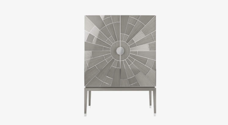 For a showstopping piece of storage, look to the CASABLANCA tall cabinet. Crafted from glossy wood veneer, a pattern of polished stainless-steel bursts across the surface like the sun's rays. The interior is organised with a leather-fronted, suede-lined drawer and embellished with a gris mirror back.