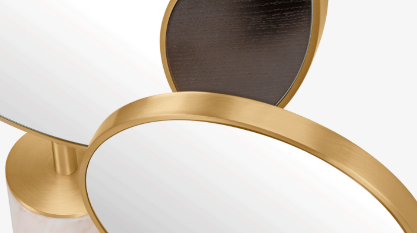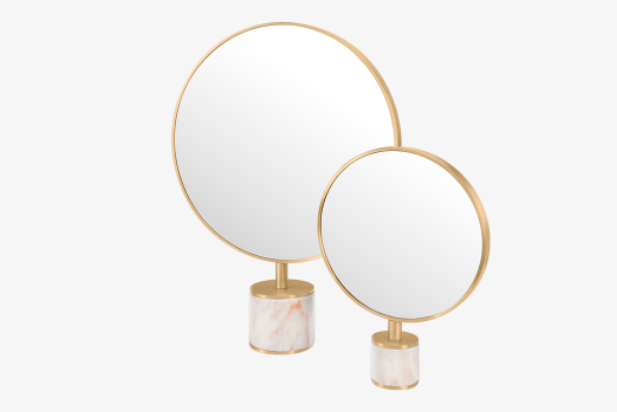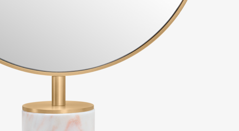 A beautiful piece to behold, the circular AGADIR Mirror is available in two different but equally practical sizes. Featuring a fuss-free silhouette, the design accentuates the looking glass while showcasing the splendour of two timeless materials: creamy stone and brushed brass.