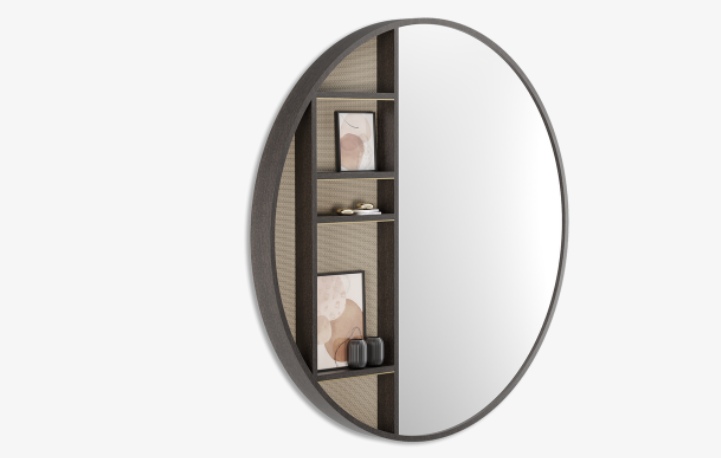 Part mirror, part display unit, the oversized BRENTWOOD is designed to make an impact. Perfect for displaying ornaments or propping artworks, the slimline shelves are crafted from wood veneer, backed with wallpaper and embellished with brushed brass.