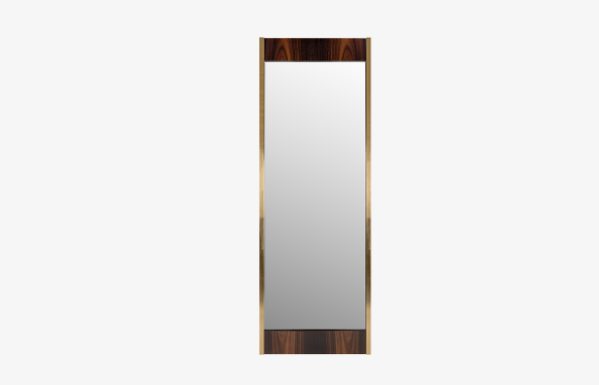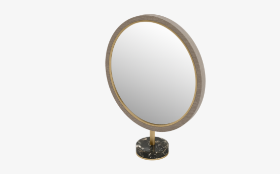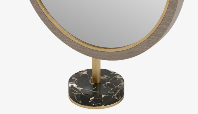 A classic looking glass design, the freestanding PARMA features a circular piece of mirror edged in brushed brass and wood veneer, an etched brass stem and a weighted base of stone layered over brushed brass.