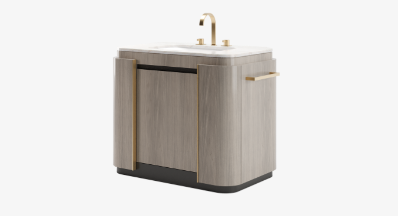 With its elegantly curved form, the SOCHI vanity brings a feminine feel to your bathroom. It features a glossy veneer and brass accents in soft tones.
