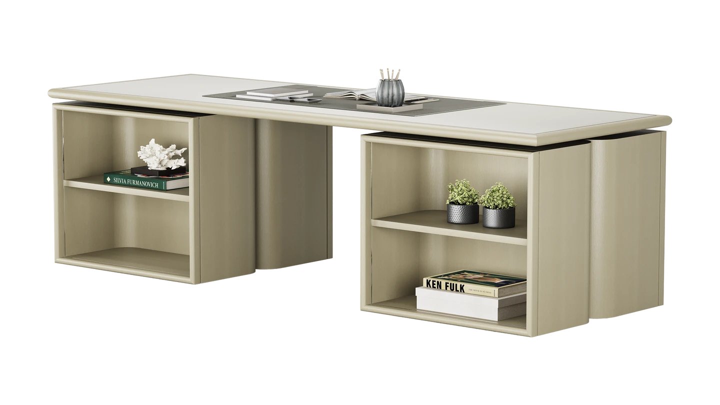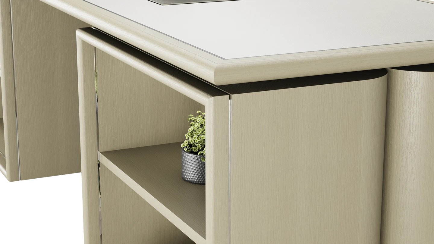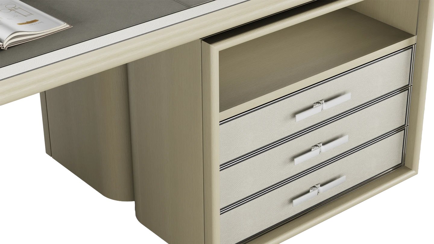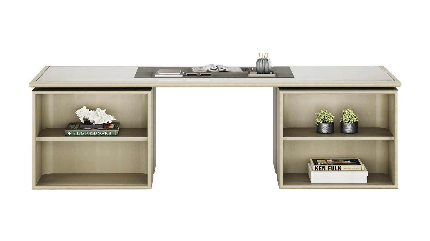 The HATTA II Desk combines solid lines and premium details. It’s crafted from satin open pore wood with leather inlays and stainless steel details. With a spacious workstation and storage, it’s as practical as it is pleasing.