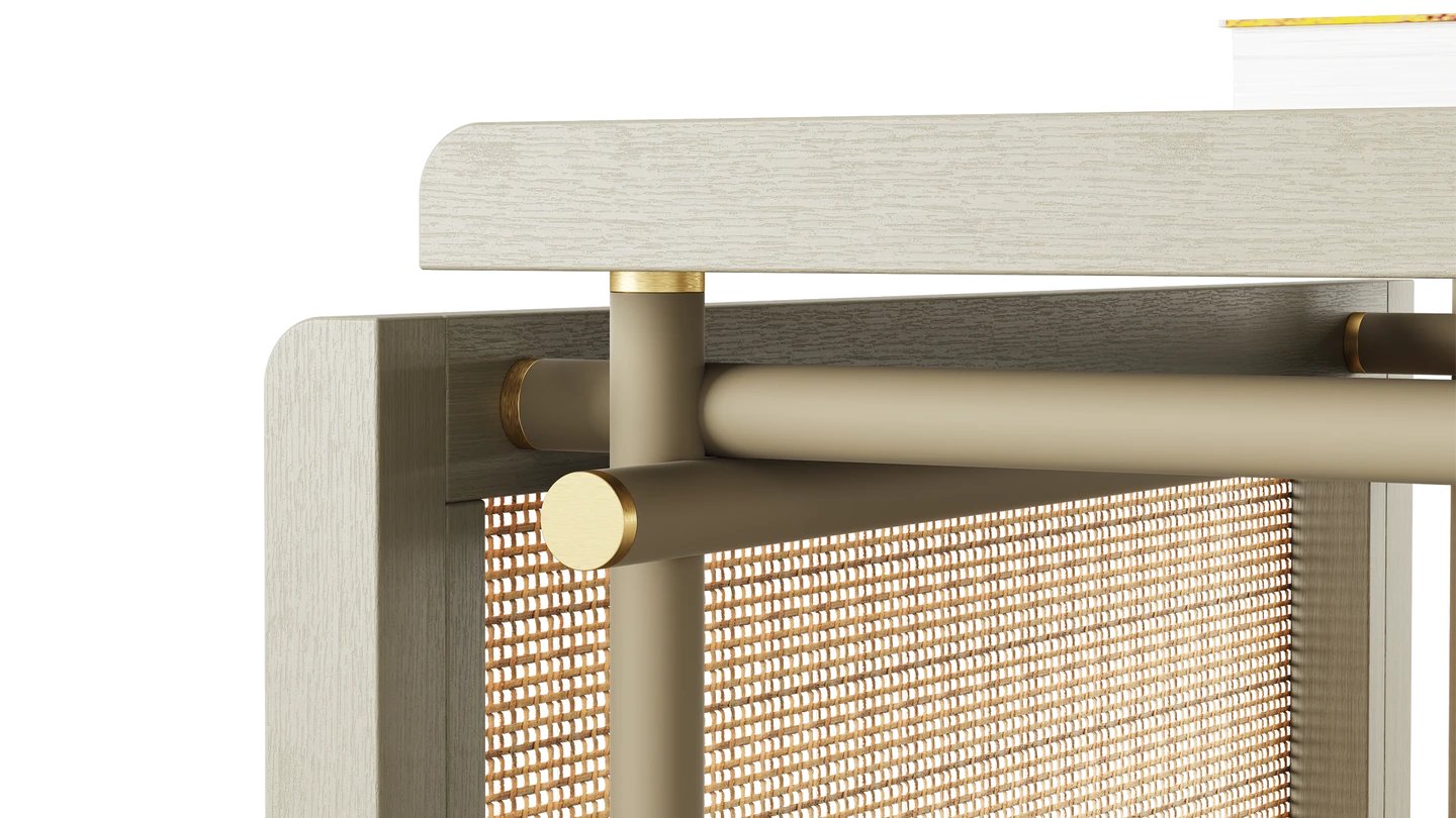 The KEA Coffee Table is a striking centrepiece, combining satin open pore wood and rattan. A bronzed mirror top and brushed brass details bring an easy air of elegance.
