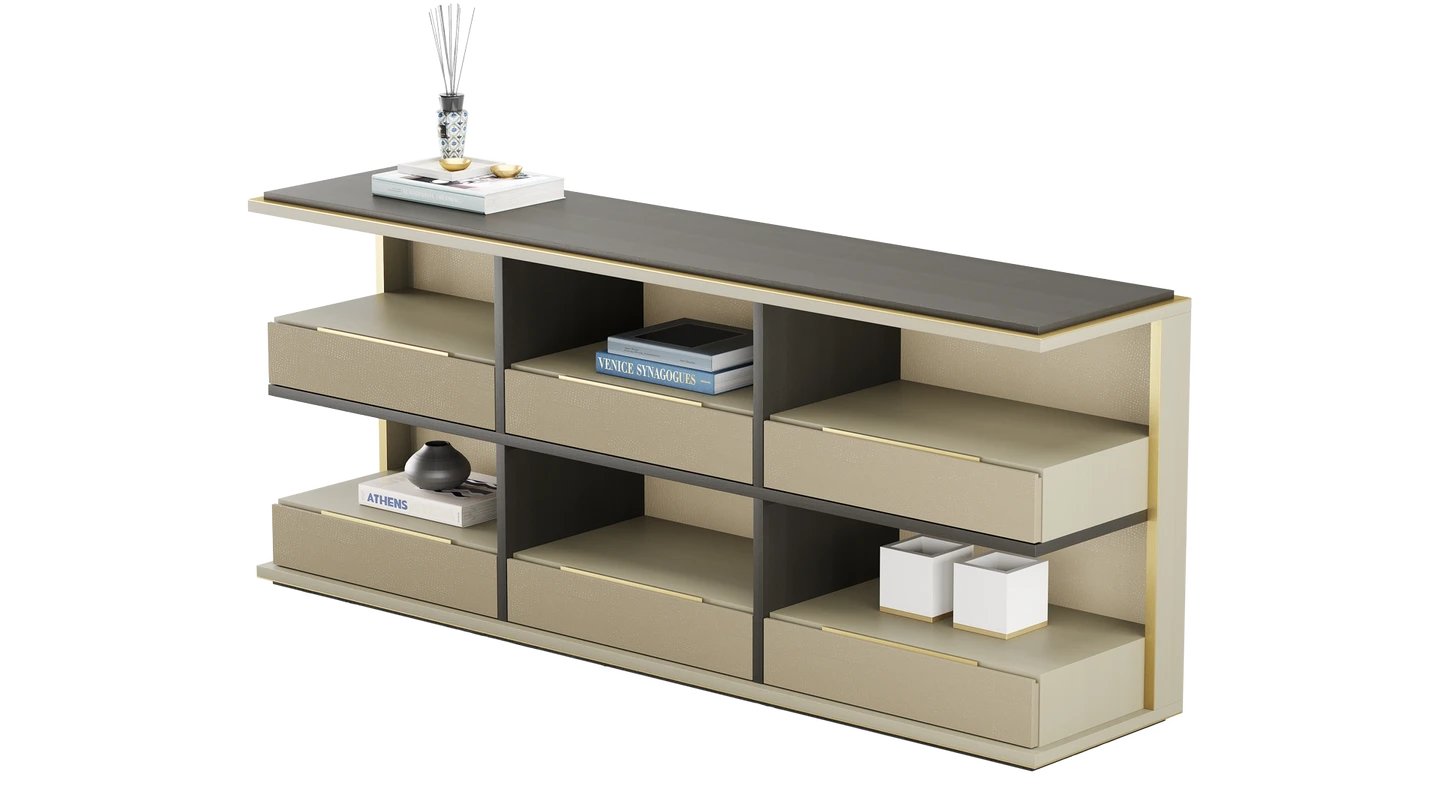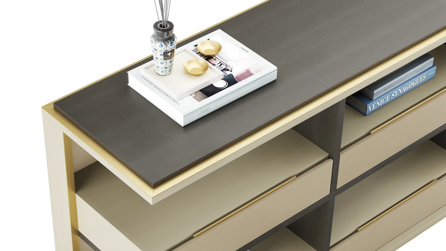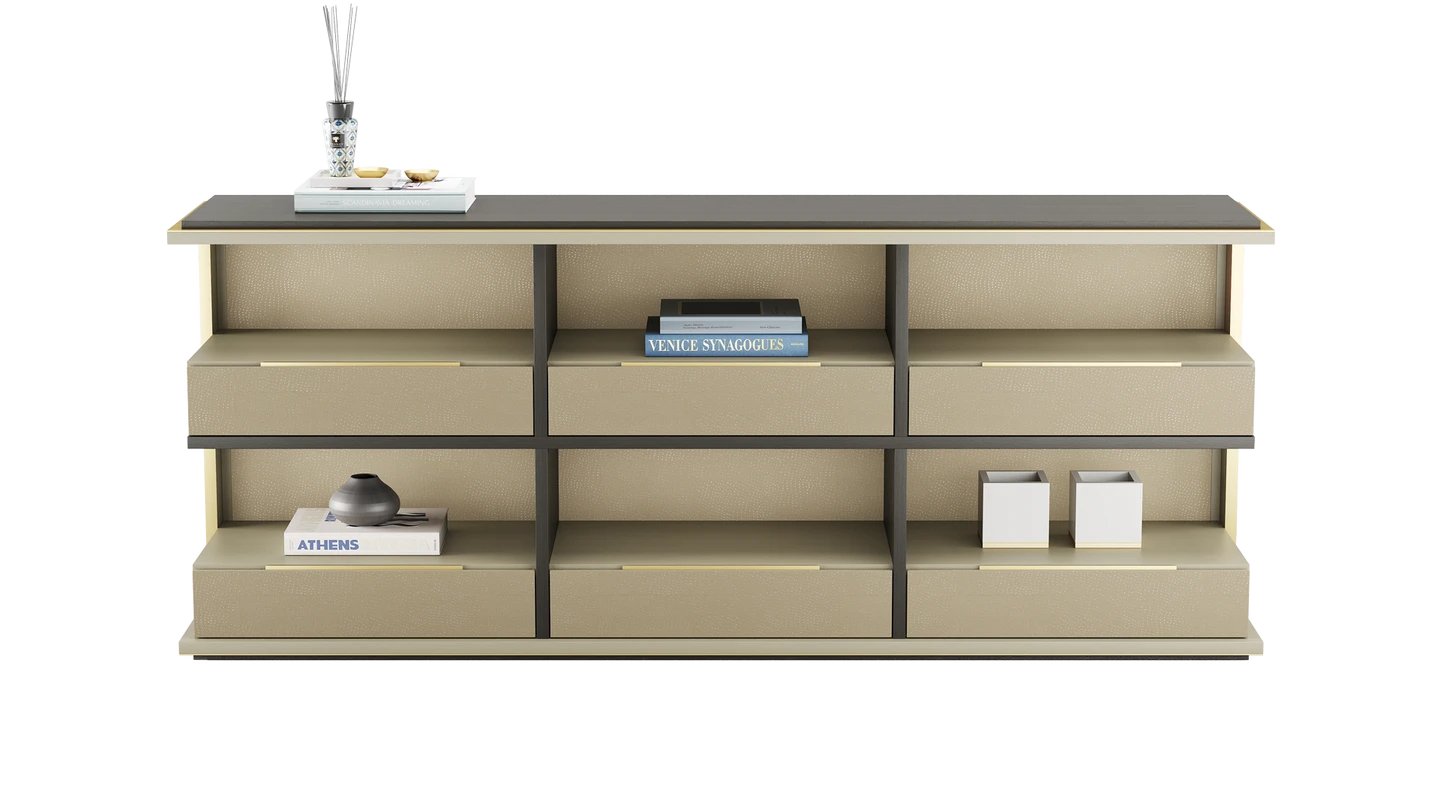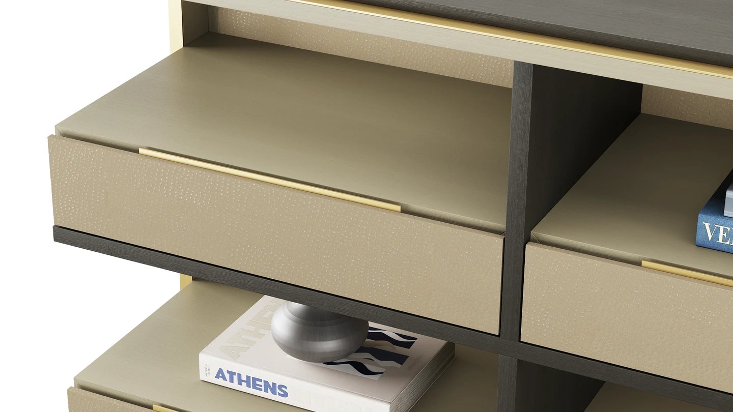 Our MARFA Sideboard perfects the balance between simple and statement. It's crafted from premium satin open pore wood and features leather and brass highlights. The box drawers give optimal space for both storage and display.