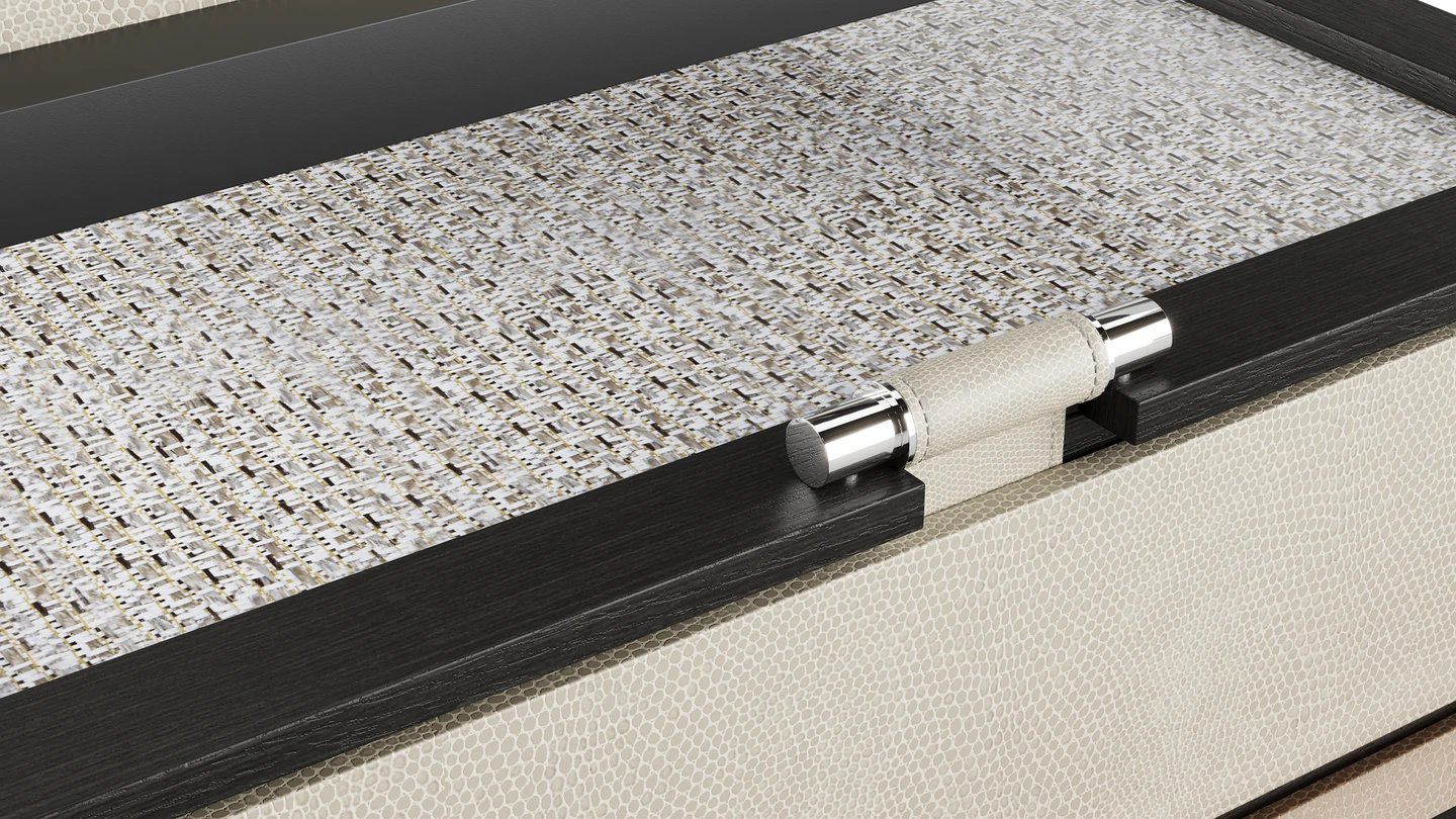 A true icon, the SYRACUSE Coffee Table combines several premium materials. The structure is crafted from wood and iron, whilst the top and base are from contrasting glass and bronze mirror. Suede and leather inlays add a sophisticated finish.