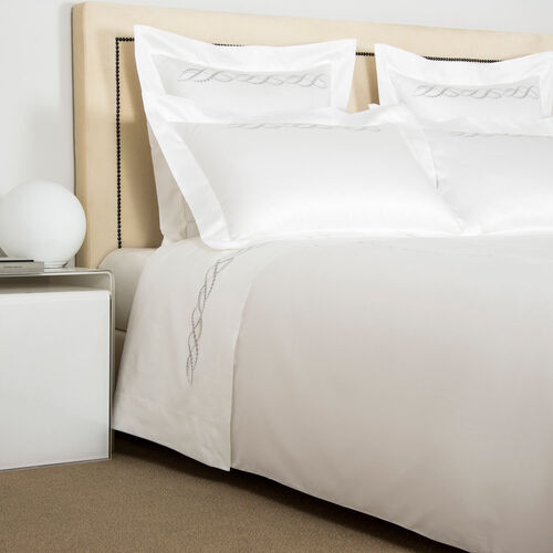 The Pearls Embroidered duvet cover features a stylish design consisting of dotted lines that intertwine in a helical pattern. The dots in the pattern are of varying sizes, bringing to mind the elegance and beauty of fine pearl jewellery. The duvet includes four lines of this delicate embroidery, arranged in a square in the centre of the cover, bringing a feeling of peace, harmony, and refinement to your bedroom. Pure extra long staple cotton. Made in Italy.
