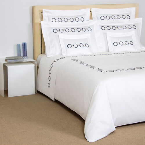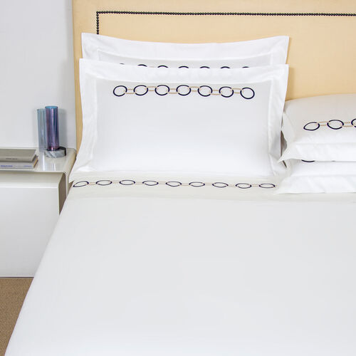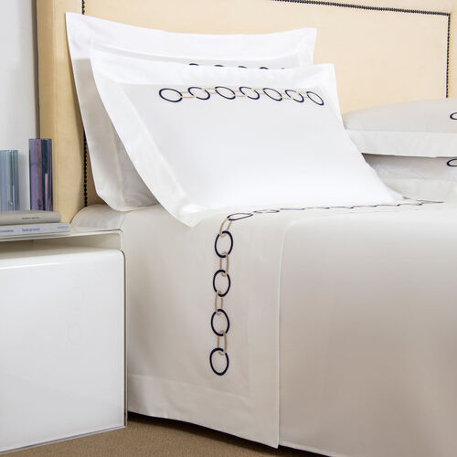 Featuring a intricately embroidered dual-tone chain design on the top sheet and shams, the Links Embroidered Sheet Set brings elegance to any master or guest bedroom. This sheet set includes a top sheet, two shams, and a bottom sheet in pure long-staple cotton sateen. 100% cotton. Made in Italy.