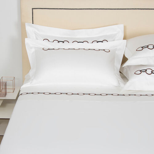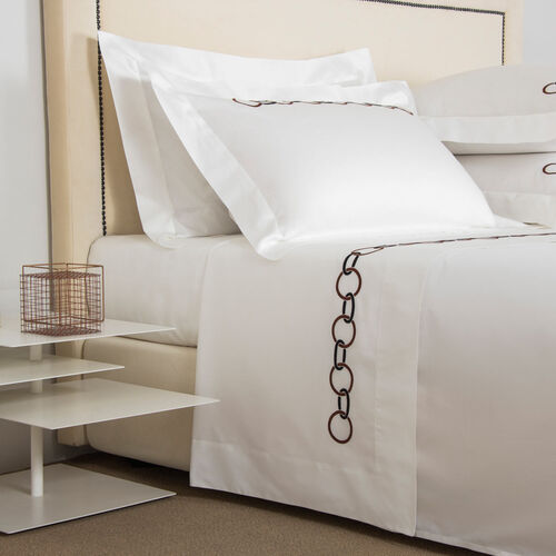Featuring a intricately embroidered dual-tone chain design on the top sheet and shams, the Links Embroidered Sheet Set brings elegance to any master or guest bedroom. This sheet set includes a top sheet, two shams, and a bottom sheet in pure long-staple cotton sateen. 100% cotton. Made in Italy.