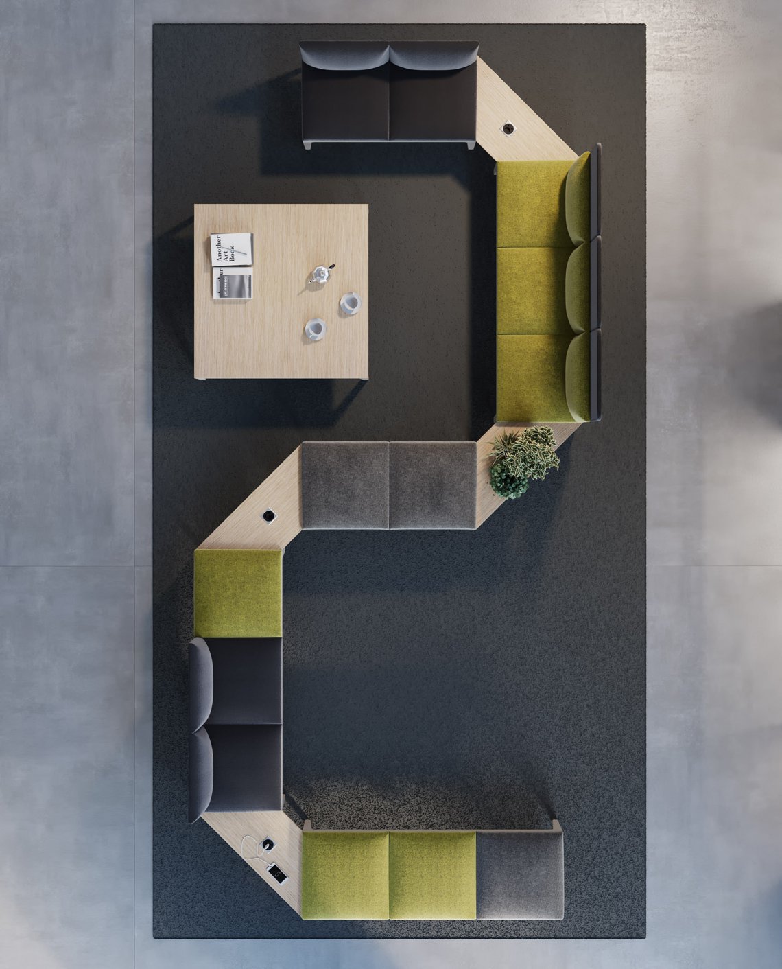 Alle tradizionali postazioni di lavoro, la flessibilità di panche, poltrone e divani Alplus crea una proposta di arredo unica ed omogenea.