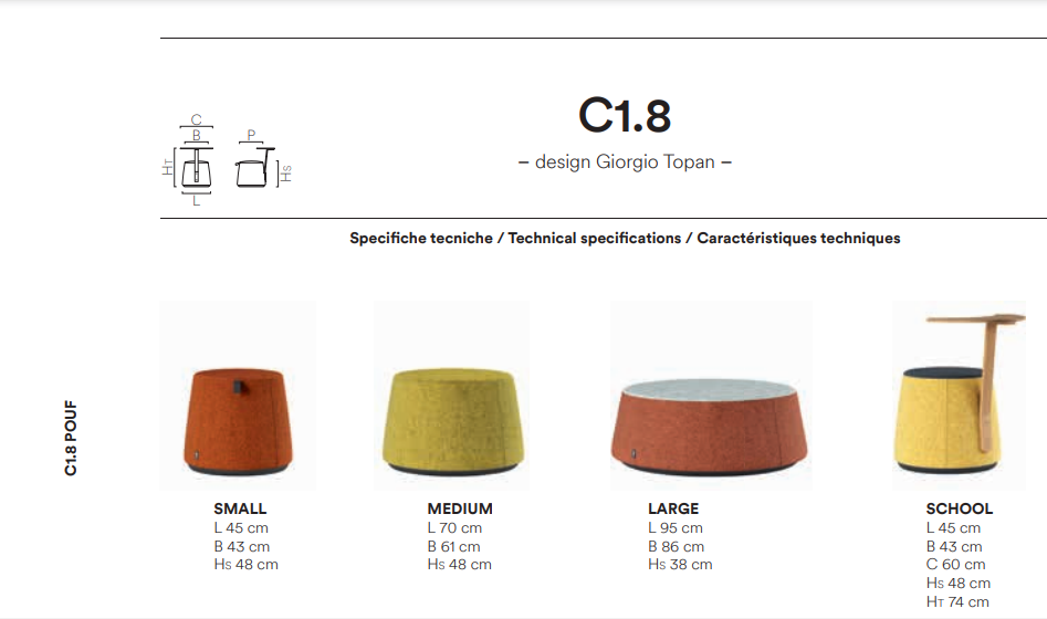 Con C1.8, nuove possibilità estetiche si coniugano con tutte le funzionalità necessarie alla formazione: flessibilità per i lavori di gruppo e quiete per lo studio individuale, perché si apprende meglio in ambienti che ispirano. La serie comprende anche un pouf integrato di una ergonomica tavoletta-scrittoio in multistrato di faggio spessore 12 mm che diventa un utile piano d’appoggio e sottolinea ulteriormente la funzionalità e il carattere. L’altezza da terra del pouf con tavoletta è di 74 cm.