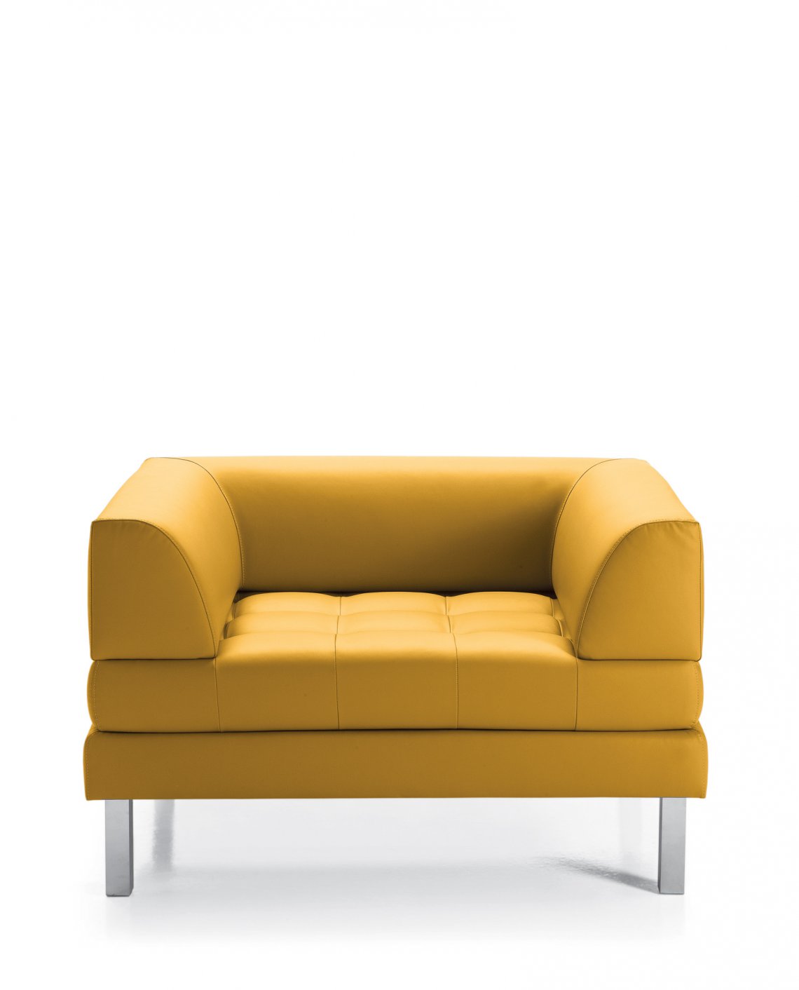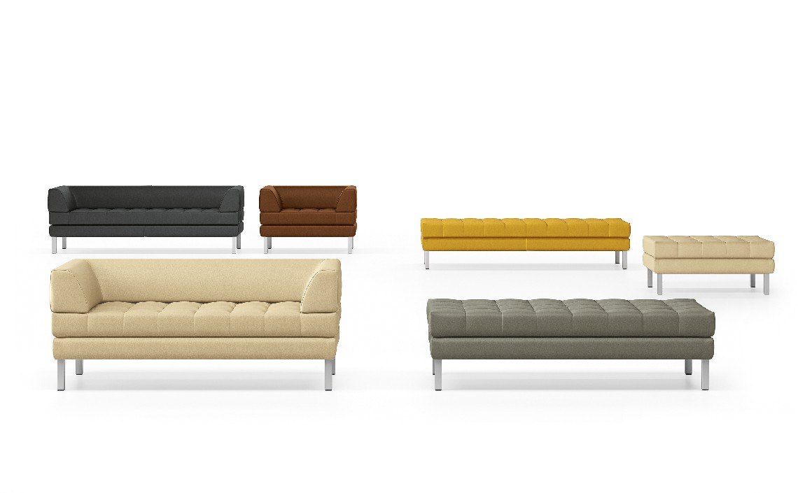 Dimensioni compatte, come si richiede in un ambiente di lavoro, schienali bassi e profondi e sedute molto ampie caratterizzano questa collezione, composta da un modello di poltrona, un divano due posti, un divano tre posti e quattro differenti modelli di panca (103 cm monoposto, da 161 cm a due posti e da 202 cm a 3 posti; i divani hanno le stesse lunghezze delle panche).