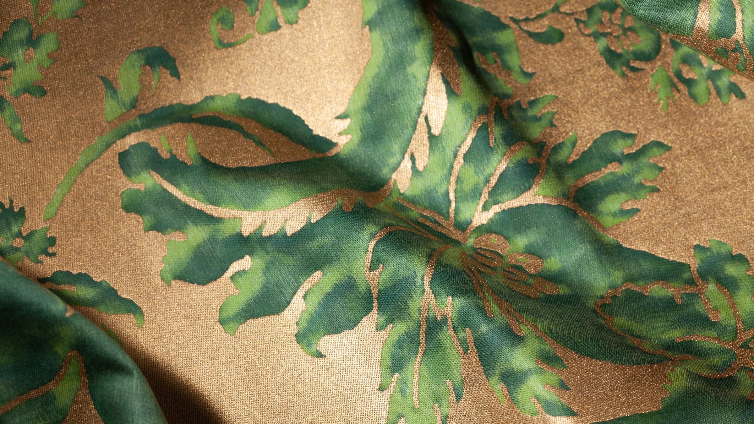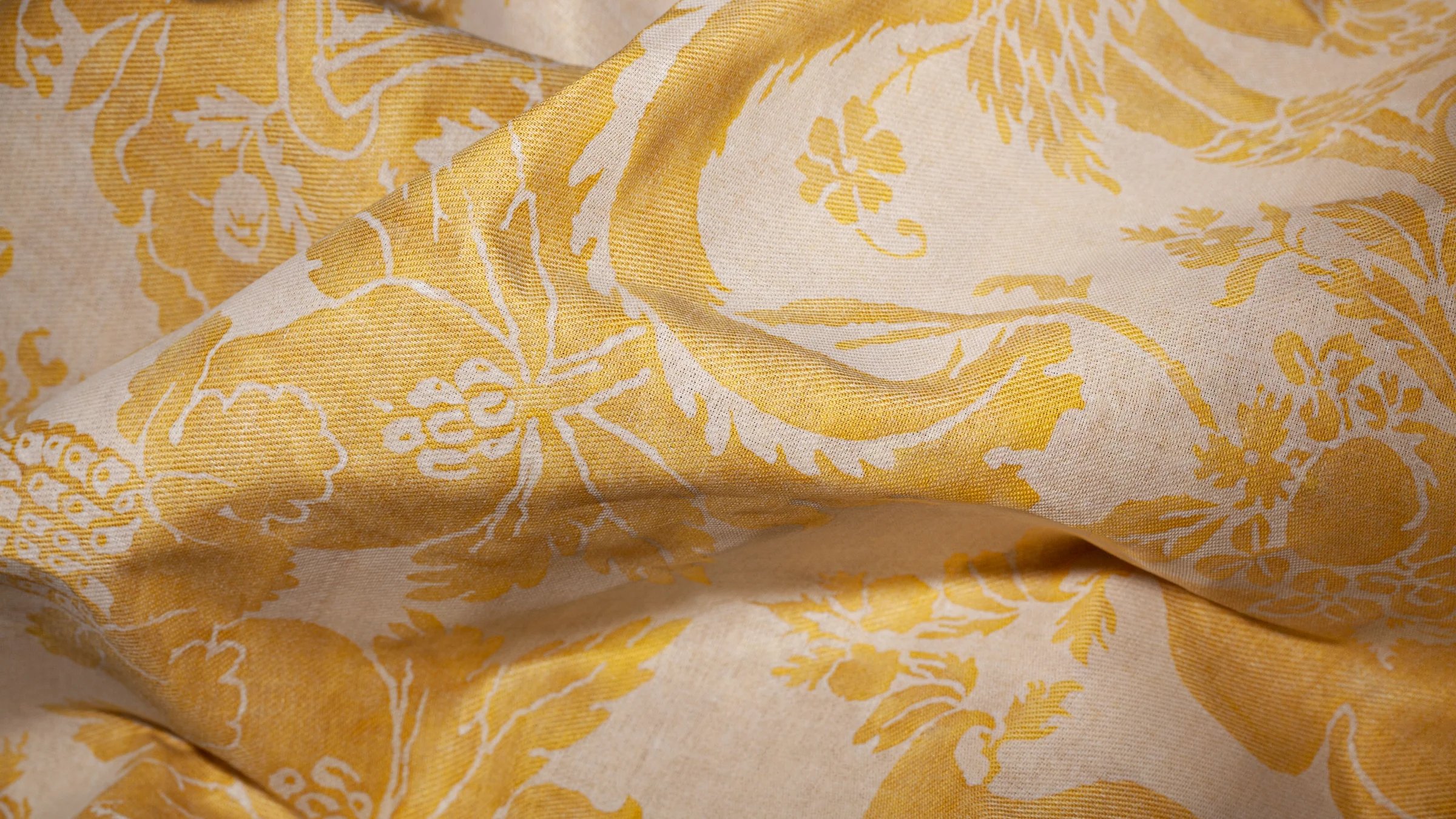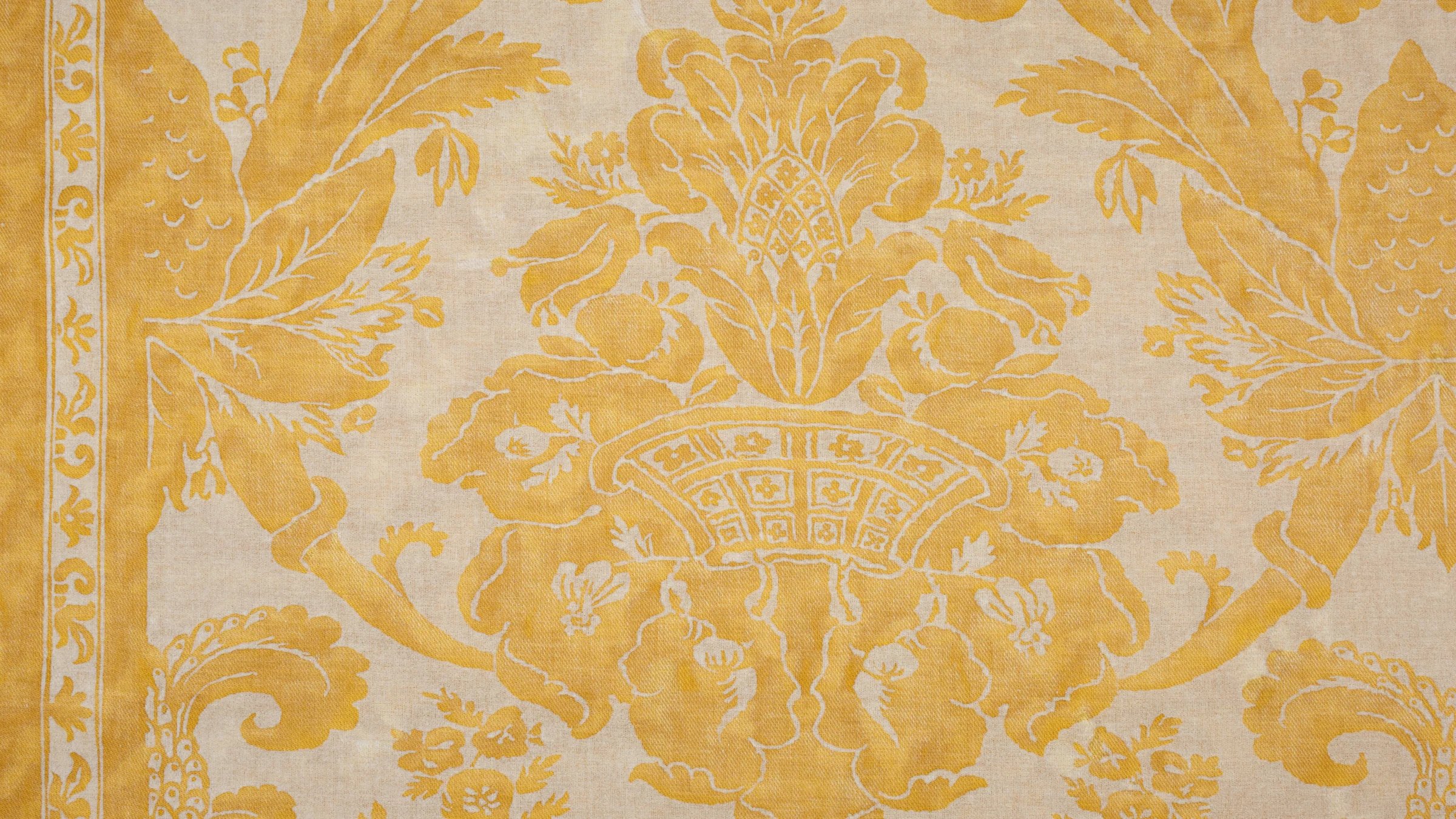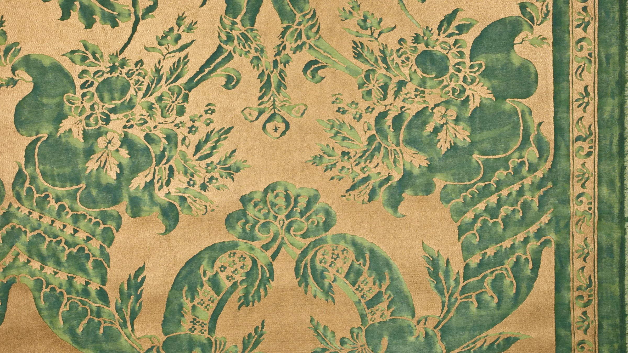 Introduced in 1955 to commemorate the A.I.D. European Conference, OLIMPIA is a 17th-century inspired feast for the eyes. Extravagant plumes trumpet and unfurl, framing abundant cornucopias and urns flowing with fruit and flowers. So named for Mount Olympus, OLIMPIA is fit for gods and mortals alike.
