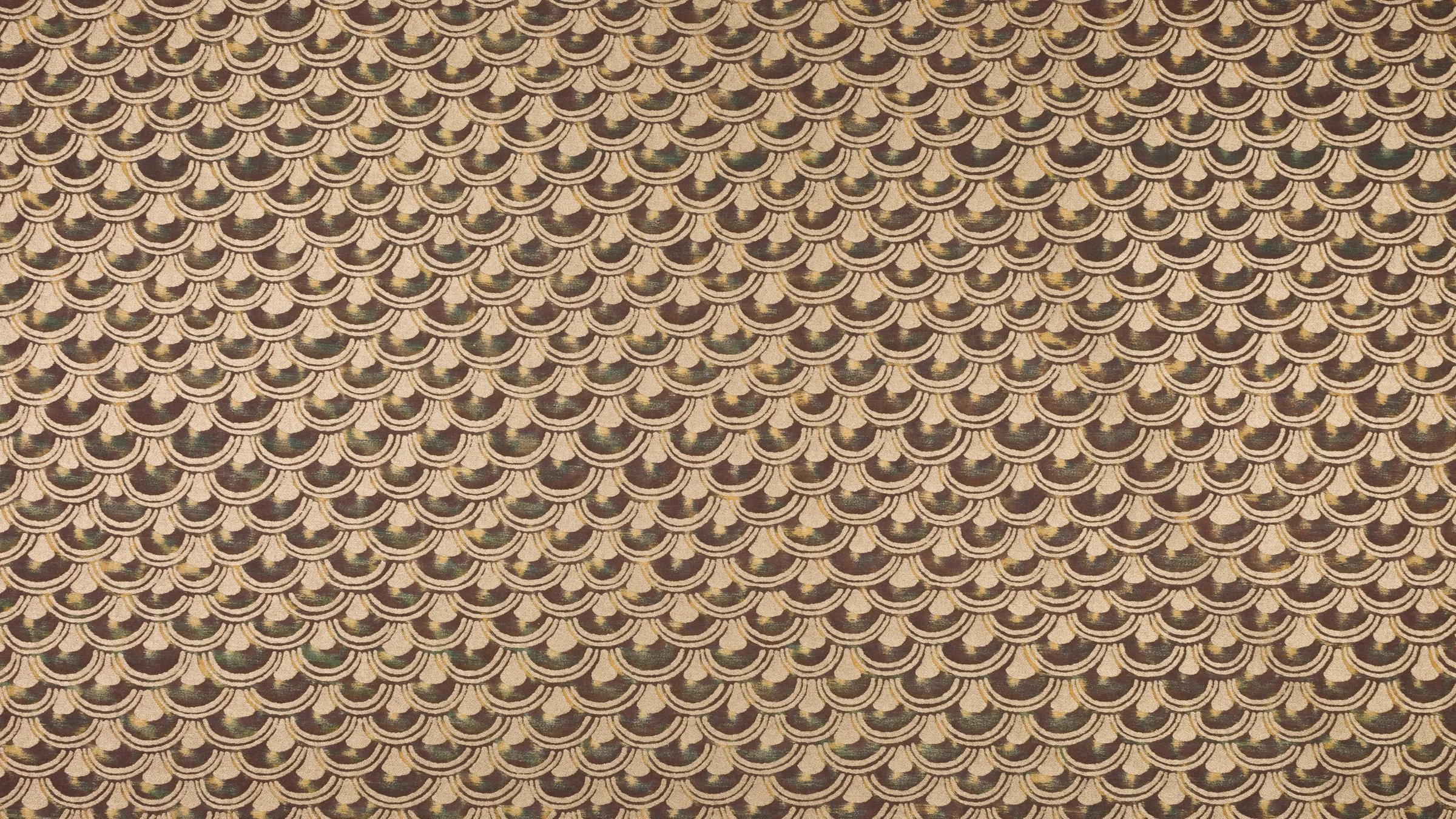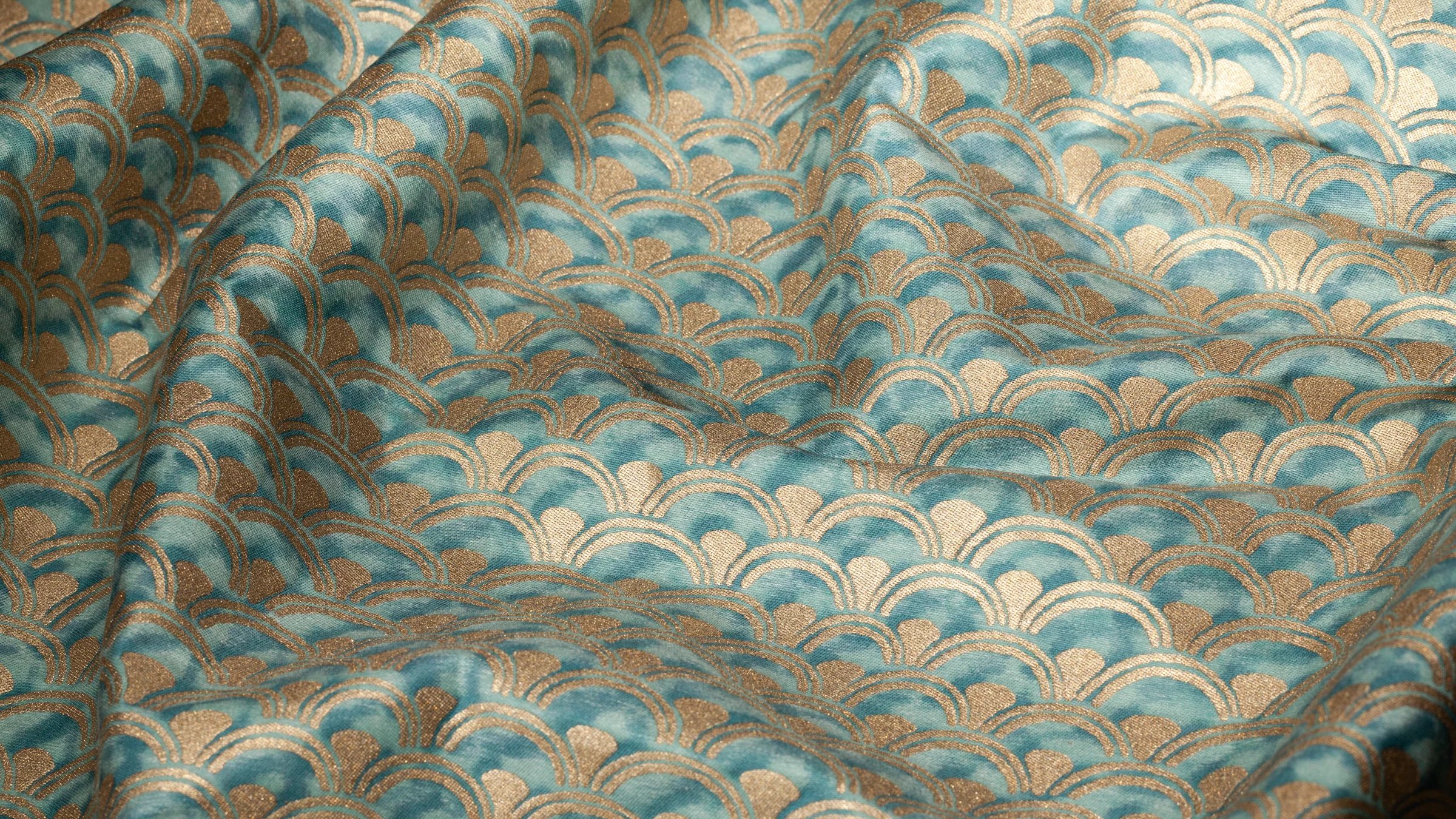 Simple in design, PAPIRO is an early 20th-century teardrop scallop motif derived from the early drawings of Mariano Fortuny. PAPIRO suggests a reedy marsh and the fan-shaped blossoms of the papyrus.