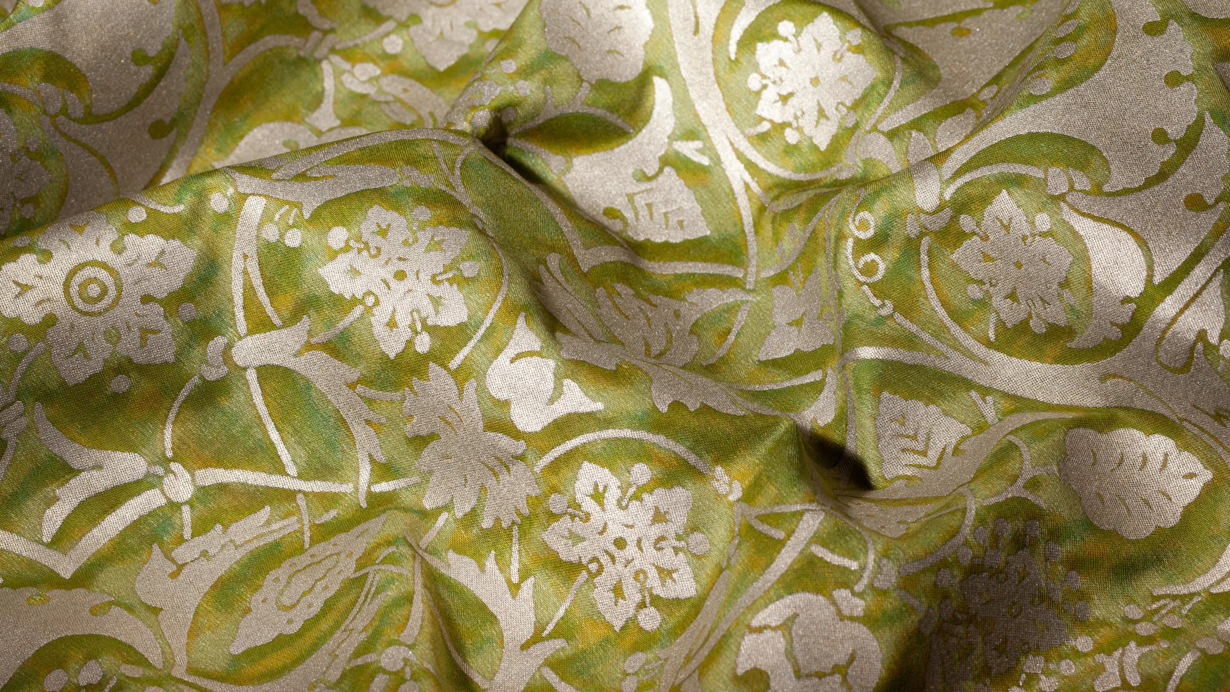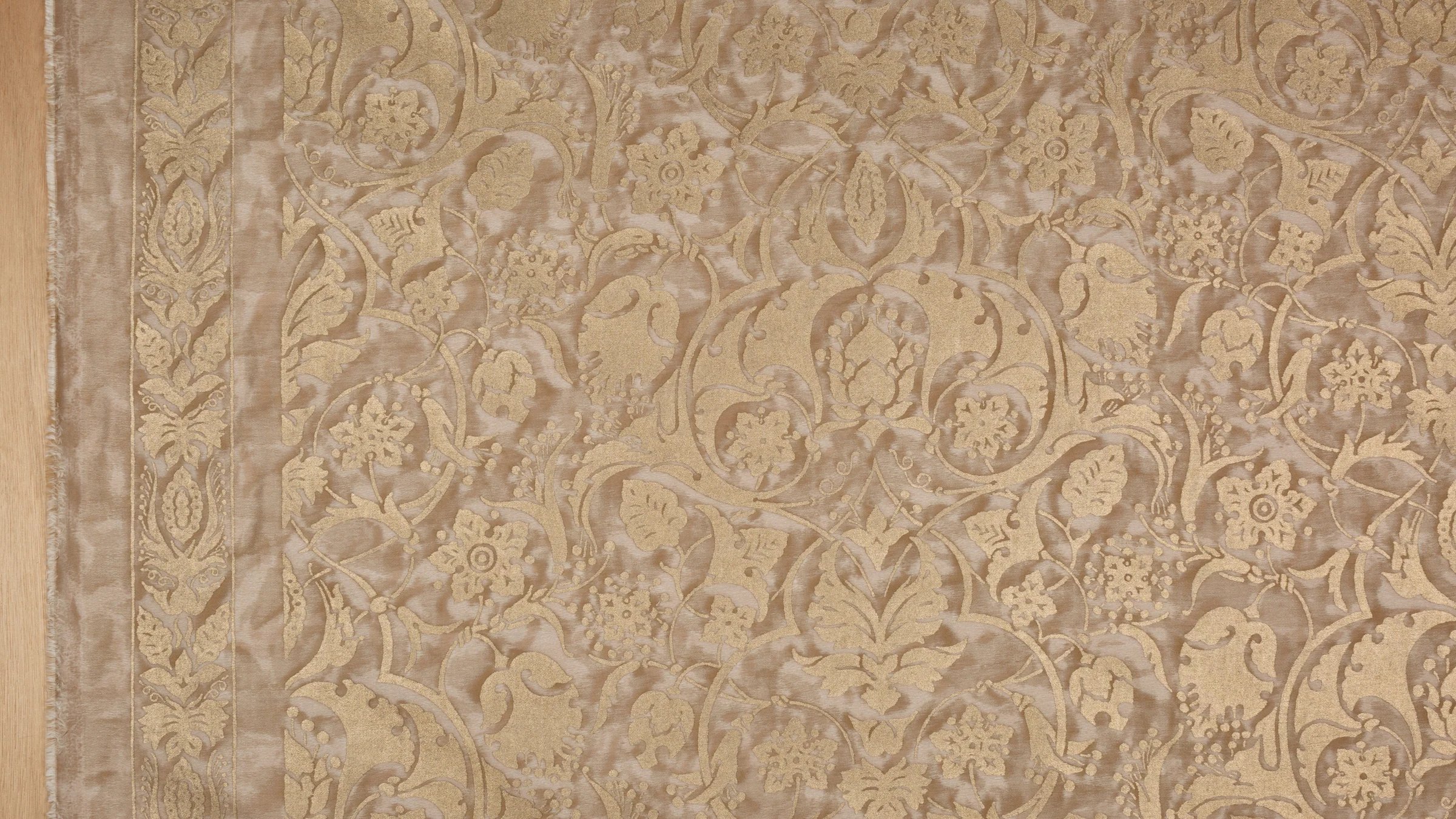The Paris of Mariano Fortuny’s childhood was filled with excitement and intrigue, as vivid depictions of PERSEPOLIS’s ancient city were first published in Voyages en Perse de MM. Eugene Flanin peintre et Pascal Coste architecte, including over 350 revolutionary illustrations of the ruinous city. PERSEPOLIS, the ceremonial capital of the ancient Persian empire built by Darius the Great, continued to captivate Mariano Fortuny’s imagination years later, inspiring this whimsical and spirited pattern filled with sensual Persian floral, leaf, and pomegranate motifs.