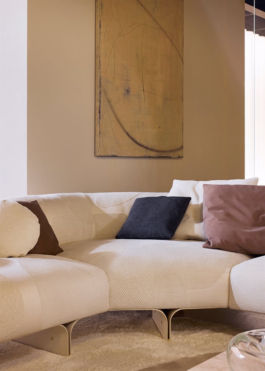 Divano modulare con base in frassino curvato tinto nero poro aperto e dettagli in ottone lucido. Disponibile anche versione laccata opaca nei colori: “Rosso Persia”, “Grigio Londra”, “Nero Giza”, "Bianco Camargue", "Verde Provenza", "Blu Pacifico", "Bordeaux Etruria", "Rosa Jaipur" e "Sabbia del Nilo". Imbottito in poliuretano espanso e piuma d'oca rivestito in tessuto o pelle nei colori del campionario. Modulo terminale fornito di bracciolo terminale cilindrico in piuma rivestito nello stesso rivestimento del divano. Rivestimento sfoderabile, non disponibile per le seguenti categorie: Cat. L1, L2 e pelle cliente/C.O.L. Per la realizzazione di elementi con rivestimento in pelle sono necessarie cuciture aggiuntive rispetto gli elementi con rivestimento in tessuto.