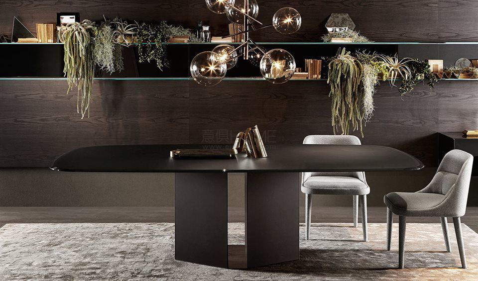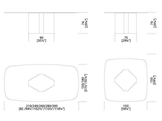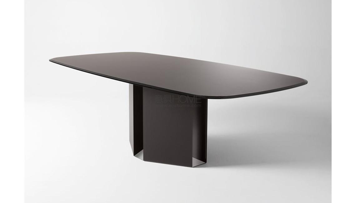 Table with 15mm painted glass top as per samples in the bright or satin version. Glass top with 3cm bevelled edge. Wooden base covered by painted glass. “Supermirror” bright stainless steel metal parts.