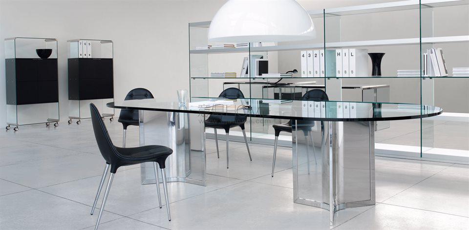 Raj Table with transparent glass top, available oval or rectangular shape. Bright stainless steel base with bright steel insert. Chromed aluminium central part. Raj Light Table with transparent glass top. Bright stainless steel base. Chromed aluminium central part.