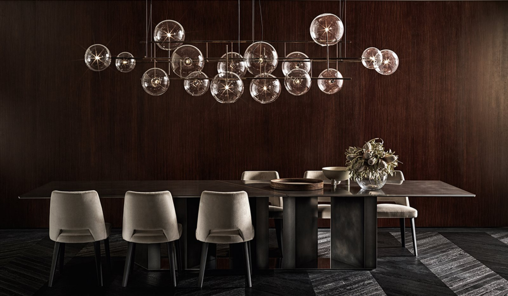 Table with 15mm modular glass top decorated by hand with an exclusive finish antique bronze/ lead. Large bevel of 4cms on the two sides. Wooden base covered by 6mm glass. “Supermirror”bright stainless steel bottom plate. Available also with bright or satin black painted glass top and with base covered by 20mm Sahara Noir marble.