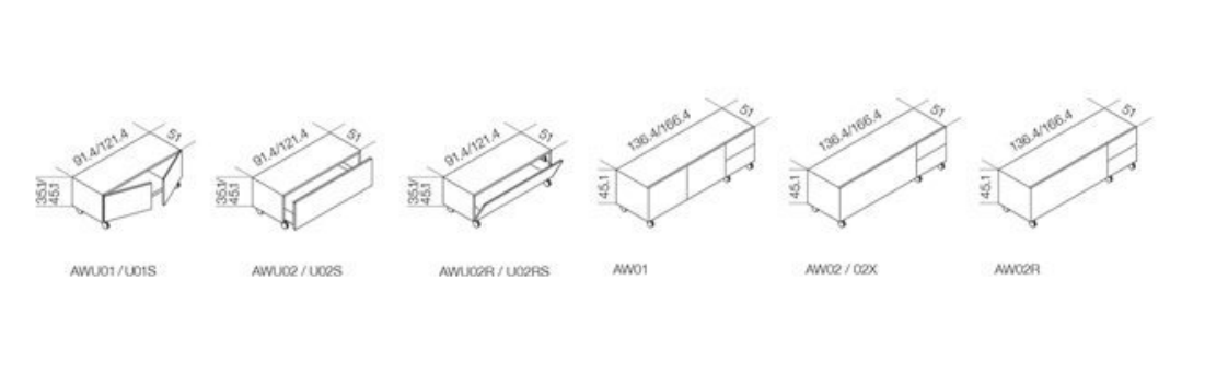 Wooden unit on castors with all sides covered by painted glass as per samples, in the bright or satin version. Available also in extralight mirror or smoked "grigio Italia" mirror. Total pull-out drawers with transparent bottom glass. Available also without wheels with grey melamine laminated wooden base (total height 38 or 48cm). With lock and cable management, on request.