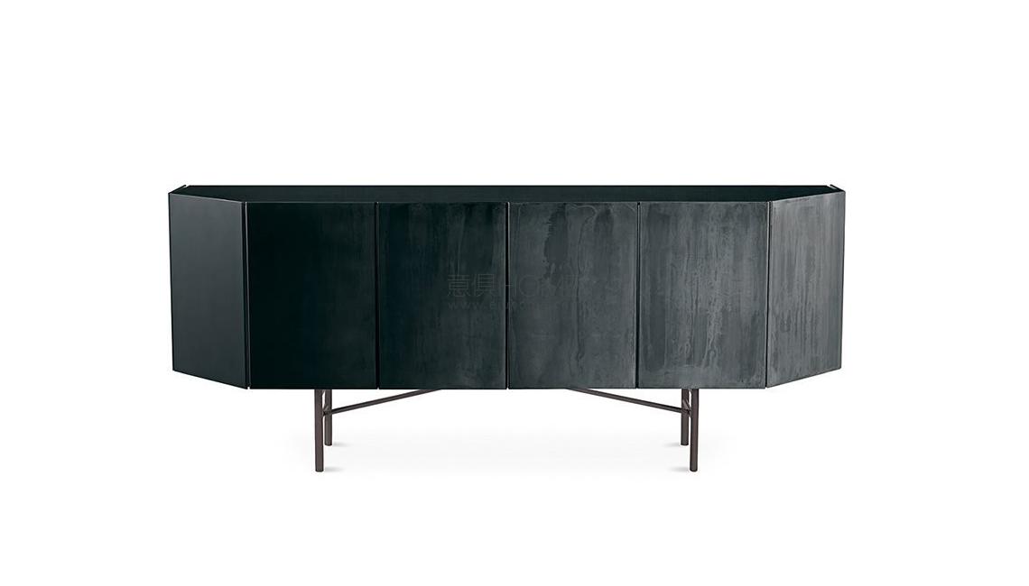 Wooden sideboard covered by 6mm tempered glass decorated by hand with an exclusive treatment. Patinated bronze lacquered base and inside part. Supplied with 8mm extralight tempered glass shelf and mirrored inside glass back. Collection in numbered edition. This finish is the result of manual oxidation and colouring of copper leaf.