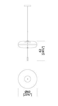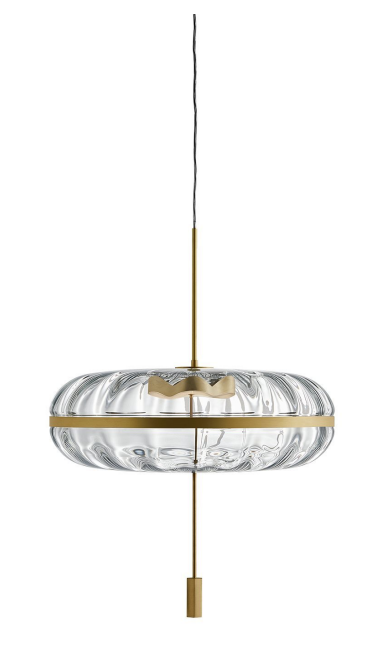 Hanging lamp with dimmable LED light (15 Watt) composed by two dome shaped section in Murano’s mouth blown glass. Satin brass metal details. Supplied with cable 4mt long