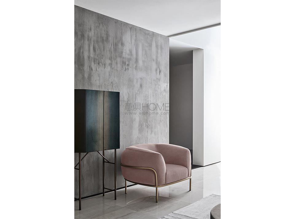 Armchair with foam polyurethane padding. Removable cover in fabric or leather, available as per samples. Metal structure in satin brass plated finish.